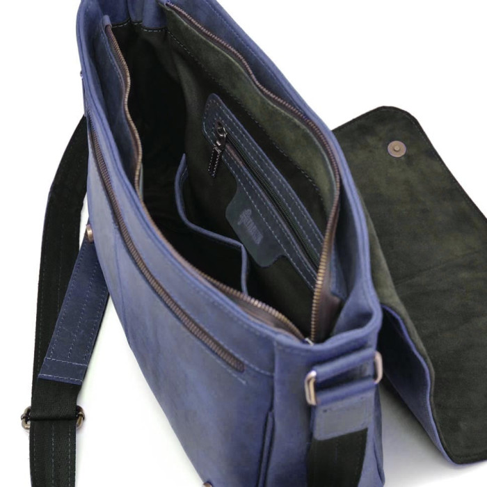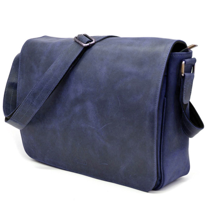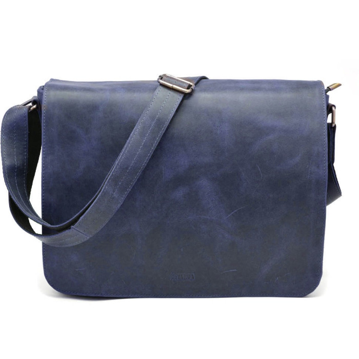 Мужская сумка через плечо с клапаном синяя TARWA RK-1047-3md, выполнена из натуральной телячьей кожи. Изделие имеет одно вместительное отделение, внутри которого располагается мягкий отсек для планшета с хлястиком на липучке, а также три кармана: один вместительный врезной на молнии и два открытых для портмоне и телефона. В основном отделении может поместиться ноутбук до 14" и документы формата А. Снаружи на лицевой стороне под клапаном есть большой плоский врезной карман с молнией. Снаружи на задней стороне - также врезной карман на молнии. Сумка застегивается на молнию, а сверху еще накрывается большим кожаным клапаном. Наплечный ремень из кожи с регулируемой длиной позволяет подобрать максимально удобное положения на плече. Аксессуар средней жесткости, отлично держит форму.