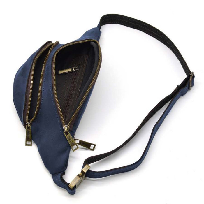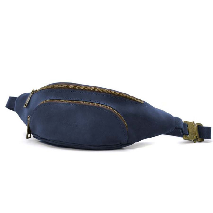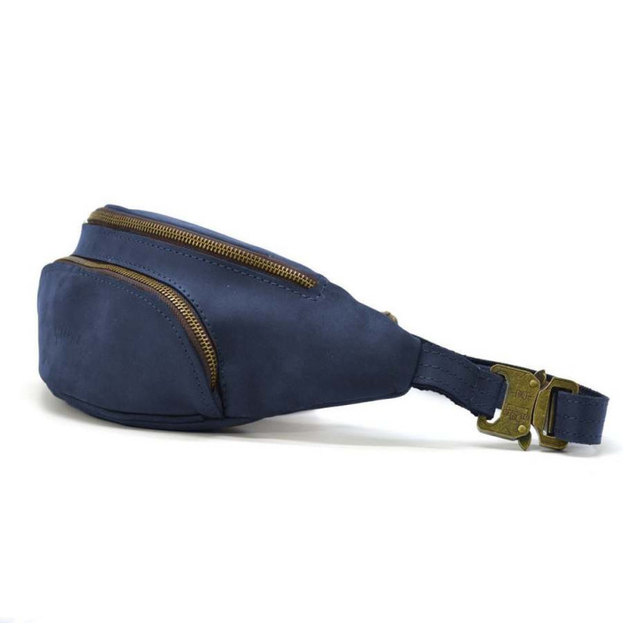 Поясная сумка бананка кожаная синяя RK-30351-3md TARWA. Модель предназначена для прогулки, поездки или путешествия - и все необходимые вещи всегда под рукой. Имеет два больших отдела на молниях, передний накладной карман на молнии. Кожаный ремень с регулировкой длинны и тактический быстросъемный фастекс Кобра в цвете антик.