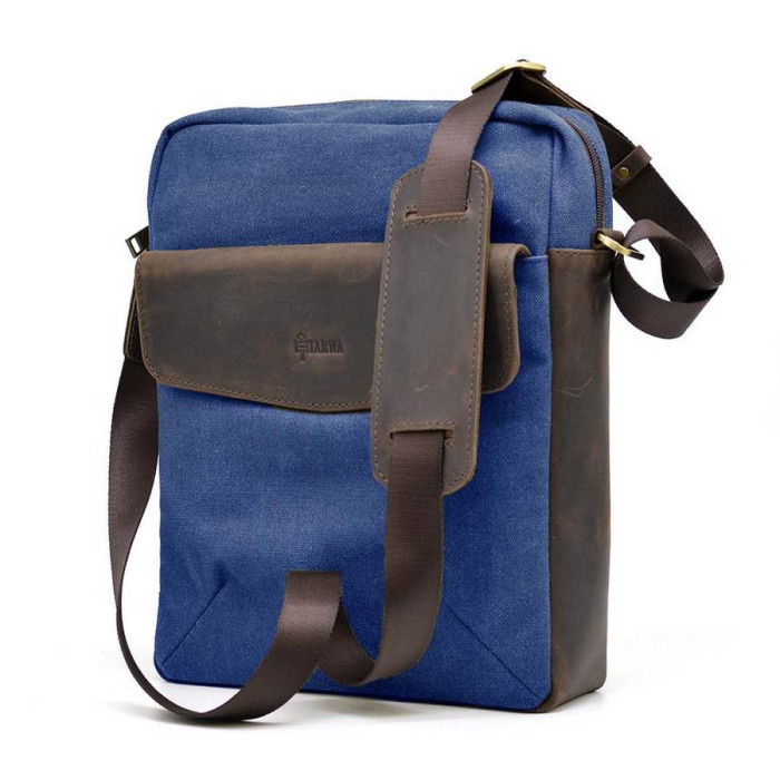 Вертикальная модель мужской сумки из канвас синего цвета с кожаными вставками из кожи крейзи хорс RКc-1810-4lx от бренда Tarwa. Подходит для повседневной носки, для учебы и работы. Вмещает формат А4. Несъемный наплечный ремень с кожаным наплечником. Качественная молния и металлическая фурнитура.