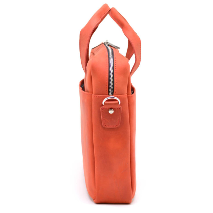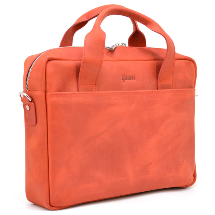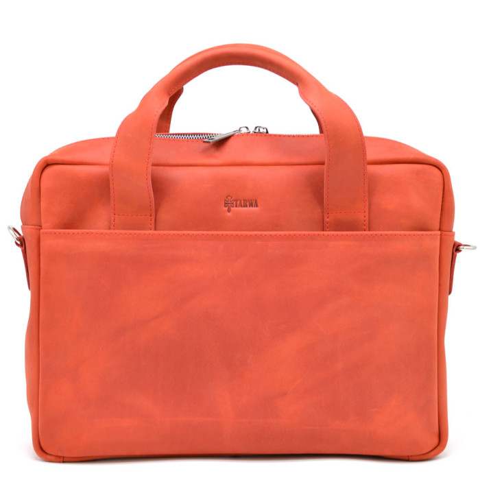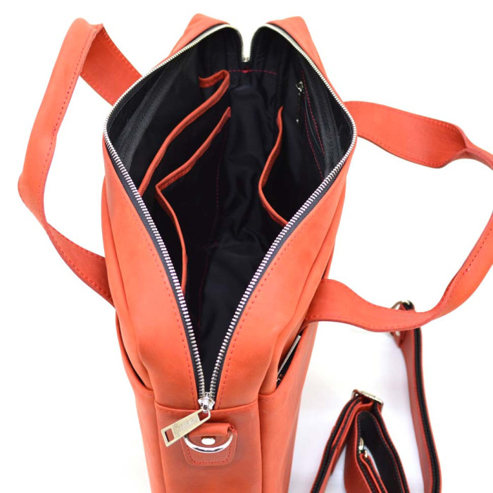 Красная кожаная сумка для макбука нотбука RR-1813-4lx, от бренда TARWA. Интересная модель для работы, выполнена в деловом стиле. Предназначена для хранения и переноски ноутбука до 15" и документов, для чего предусмотрен внутри специальный уплотненный карман-отсек. Также, внутри располагаются еще четыре открытых кармана разного размера, для смартфона, портмоне и прочего, и еще один большой врезной карман на молнии. На обеих наружных сторонах сумки имеются большие плоские карманы, застегивающиеся на молнии. Аксессуар оснащен двумя короткими ручками для переноса в руке, а также длинным плечевым ремнем из кожи с регулировкой длины.