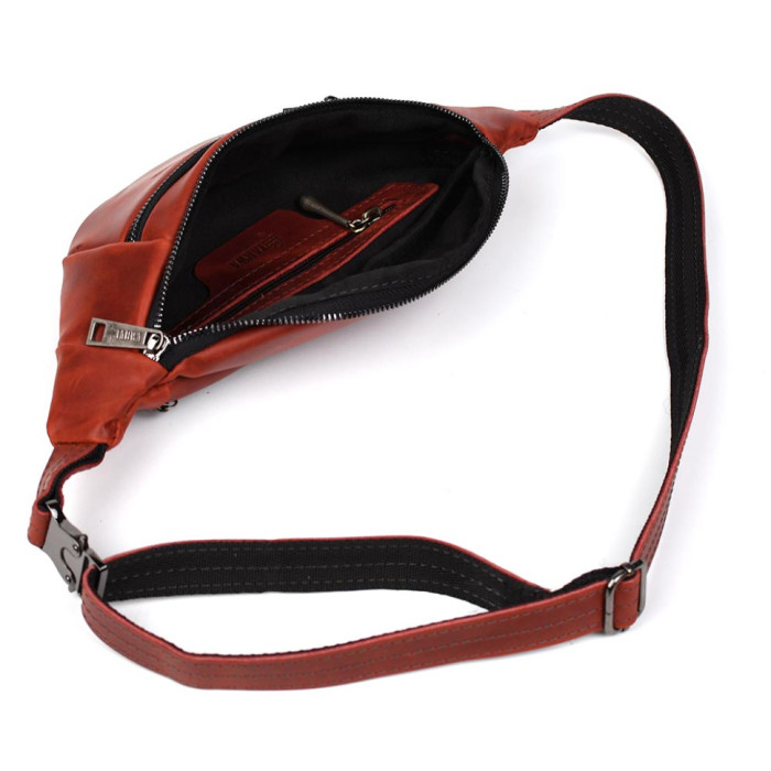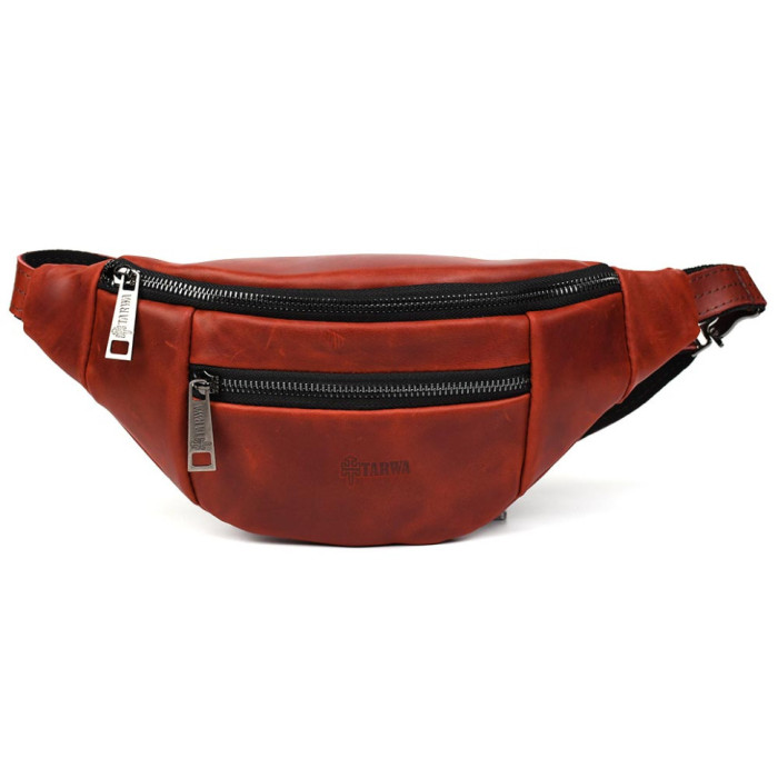 Кожаная бананка 8040 от TARWA пошита таким образом, что имеет два основных отделения: переднее объемное и заднее плоское для телефона или документов.