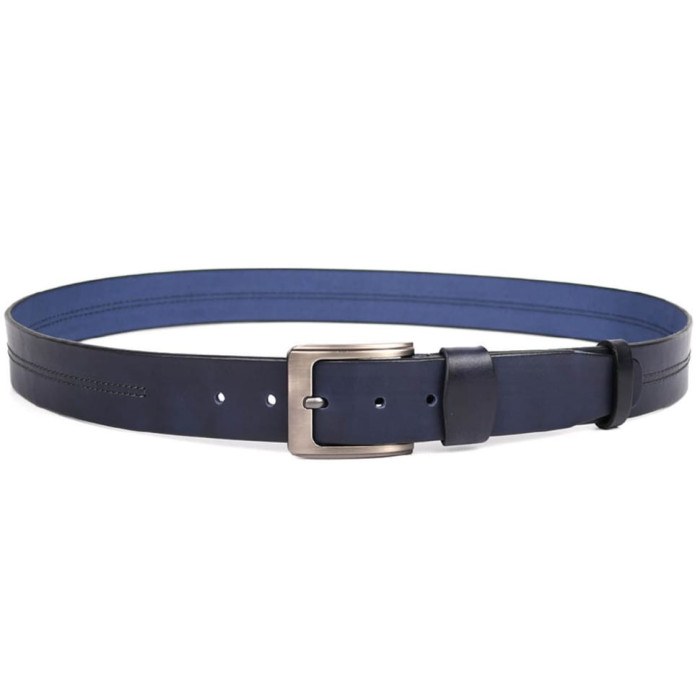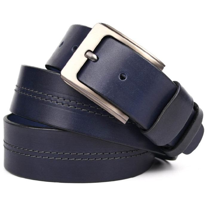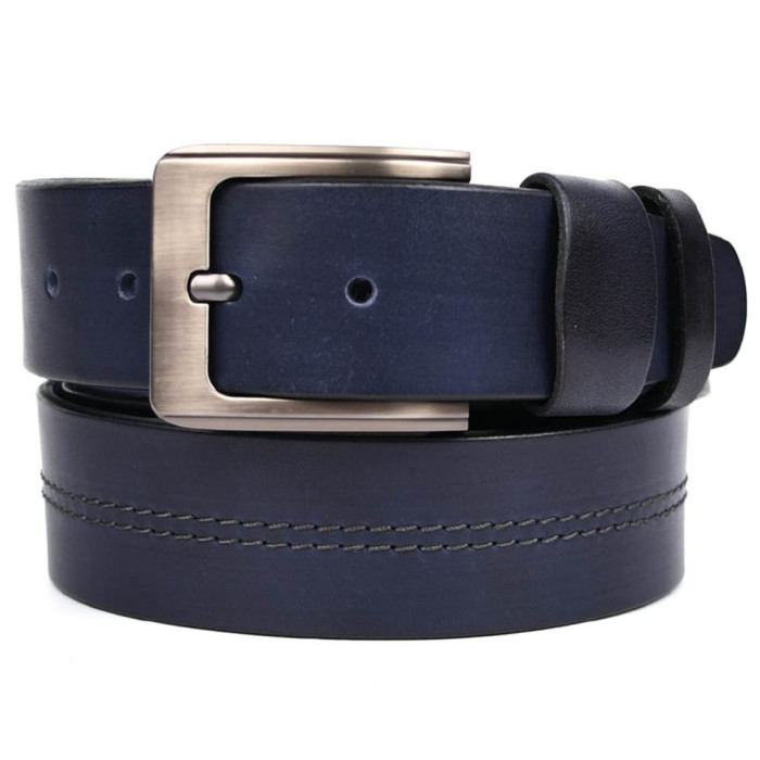 Ремень кожаный синий со строчкой 40мм мужской Limary sk400321. Гладкое полотно, строчка по центру полотна, двойная