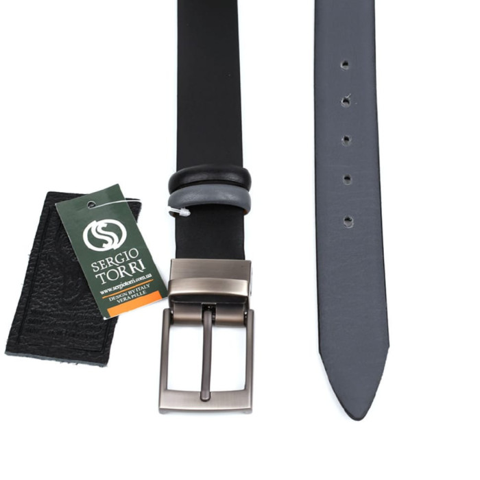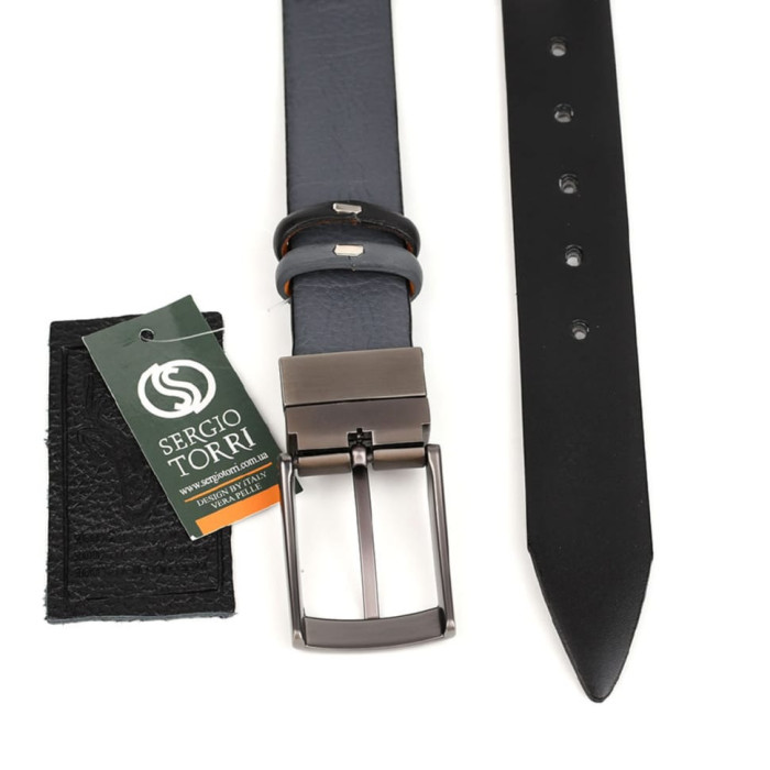 Двухсторонний классический ремень Sergio Tori st22764 из оленьей кожи с классической металлической пряжкой в цвете никель, ширина 35мм. Цвет сторон: черный и серый. Ремень подходит как для брюк, так и для джинсов. Цвет ремня меняется очень просто - поворотом пряжки. Пряжка имеет специальный механизм для быстрой смены наружной стороны полотна