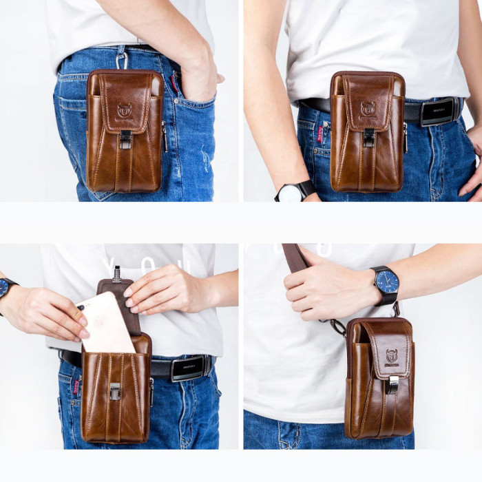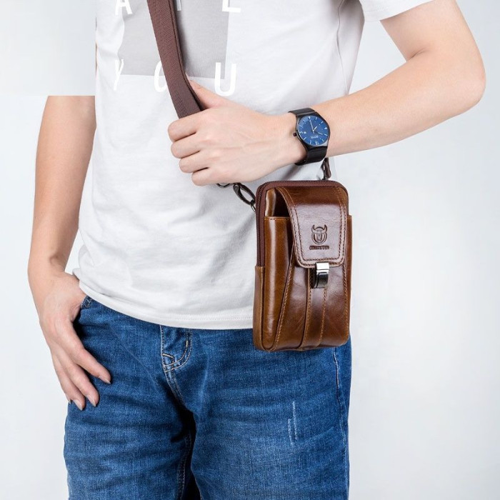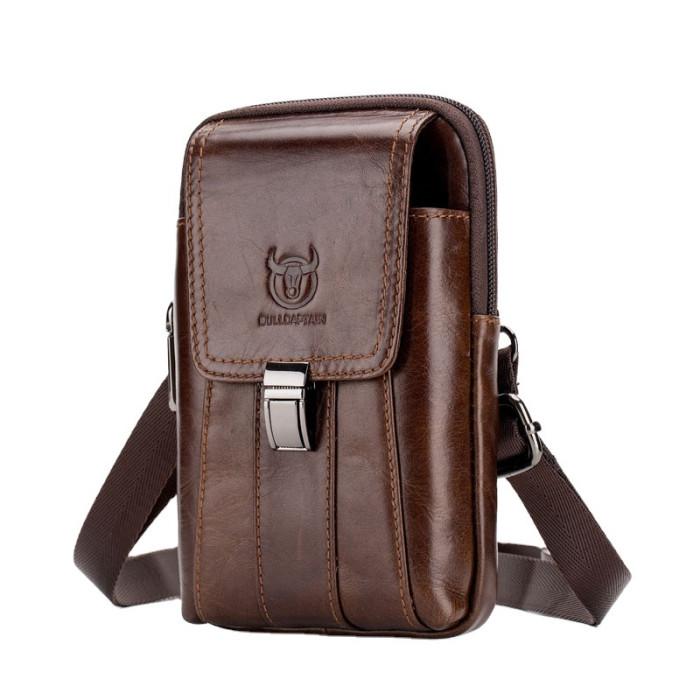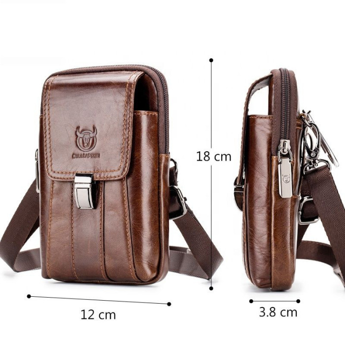 Кожаная напоясная сумка T0073 от бренда BULL может также носиться и как сумка на плечо. Состоит из основного отделения и кармана под клапаном. В комплект входит регулируемый ремешок из текстиля. На лицевой части клапана нанесен логотип бренда Bull. Небольшая сумка-чехол крепится на пояс, позволит носить смартфон, документы, кошелек и ключи.