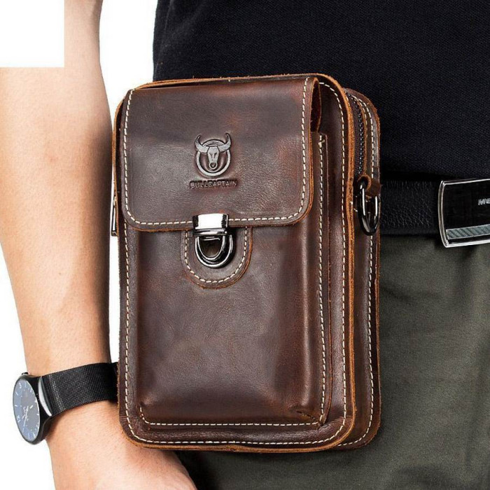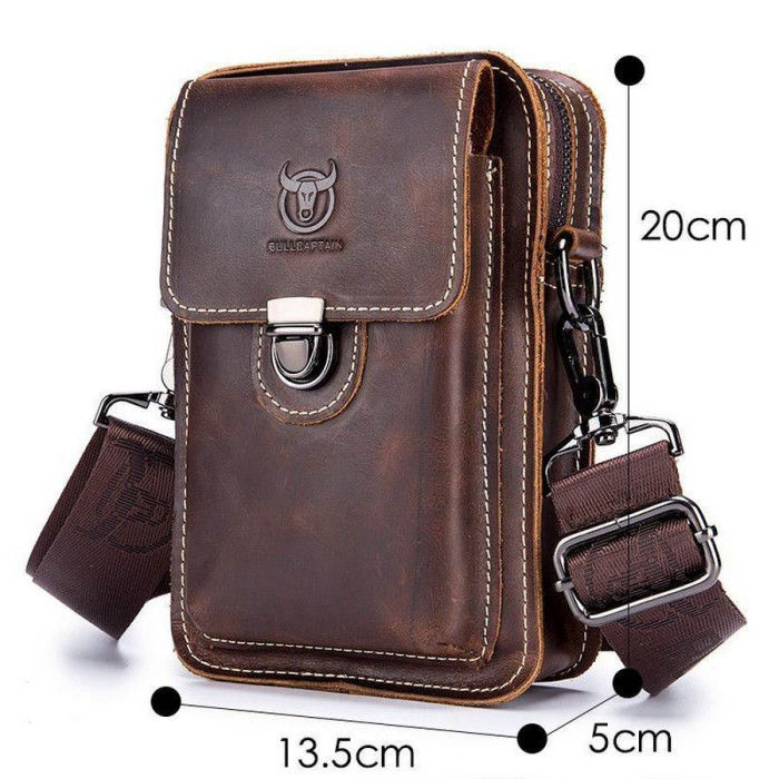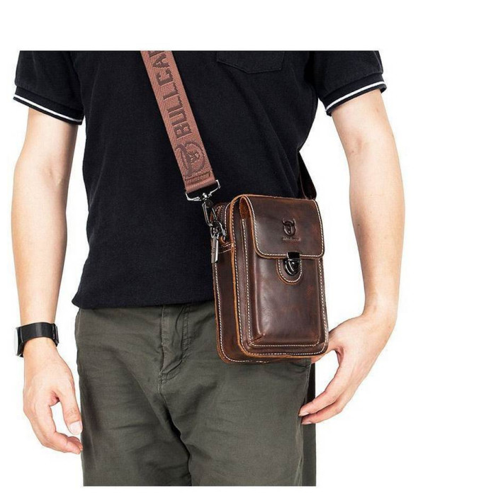 Мужская напоясная сумочка для носки на поясе и на плече. В комплект входит текстильный ремешок. Выполнена из кожи Crazy Horse, в темном коричневом цвете. Одно основное отделение, внутренний карман и накладной карман для мелочей. Застегивается на защелку.