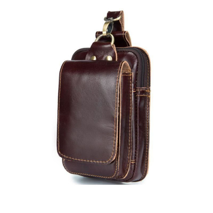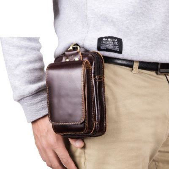 Компактная сумка носится на поясе. Для смартфона и других мелких аксессуаров. Состоит из основного отделения и внешнего кармана. Есть карабин для крепления. Карман закрывается на кнопку.
