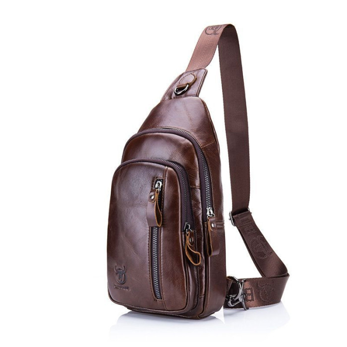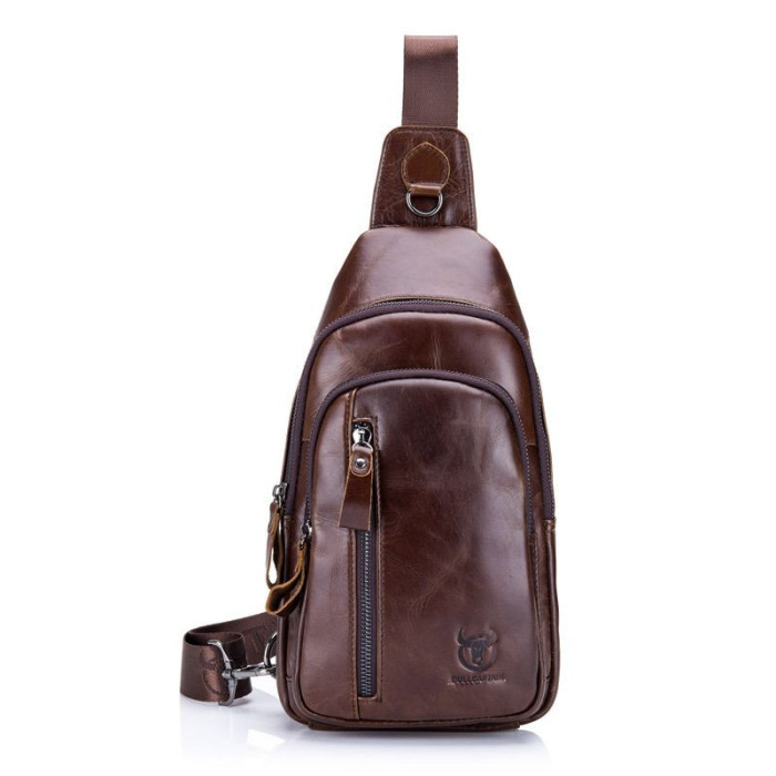 Кожаная нагрудная сумка, мужской рюкзак слинг кожаный на одно плечо T1000 от бренда BULL. Удобная шлейка перестегивается право/лево. Изделие пошито из плотной кожи, благодаря чему, хорошо держит форму даже в пустом состоянии. Состоит из двух отделений с молниями. Внутри имеется карман на молнии и открытый карман для телефона. На лицевой стороне располагается врезной вертикальный карман с молнией. На задней стороне есть врезной кармашек на молнии. Ремешок текстильный. Имеется тисненный логотип производителя на лицевой стороне.