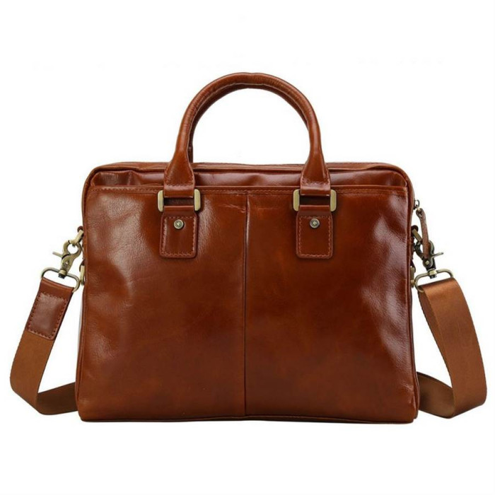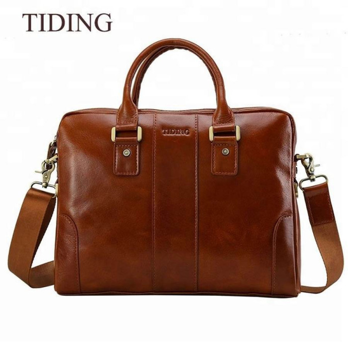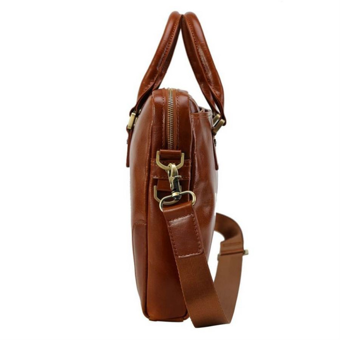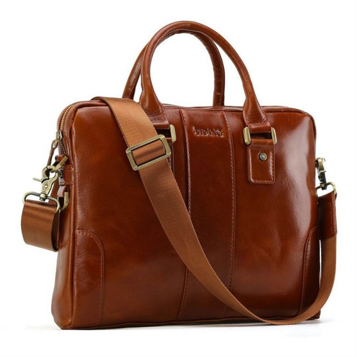 Мужская сумка-портфель из натуральной телячьей кожи tid1046 Tiding. Красивый аксессуар в деловом стиле придется по вкусу не только мужчинам, но и женщинам. Изделие выполнено с использованием высококачественных материалов и фурнитуры. Сумка на одно основное отделение с внутренним уплотненным отсеком для ноутбука до 13", документов или планшета. Еще внутри Вы найдете три кармана: один врезной и два открытых, а также кожаный держатель для двух ручек. На одной из наружных сторон располагается вместительный карман, почти на всю поверхность сумки, застегивающийся на молнию. Сумка оснащена двумя маленькими кожаными ручками для носки в руке, и наплечным ремнем с регулировкой длины для носки на плече.