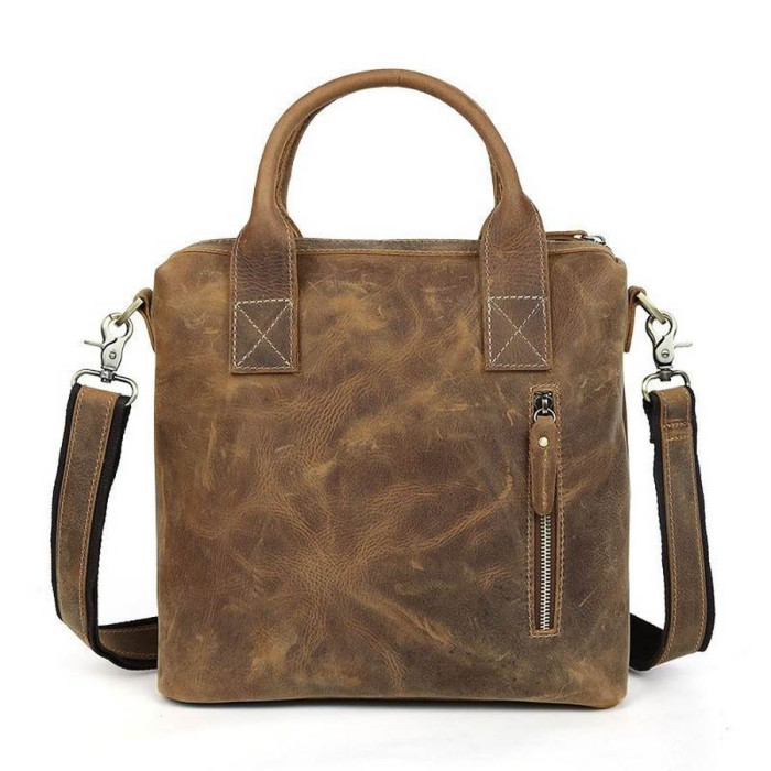 Сумка 11543 Tiding Leather, из натуральной лошадиной кожи выделки Crazy Horse, светло-коричневого цвета. Изделие имеет одно основное отделение, внутри которого имеются два накладных кармана для телефона и мелких предметов, и ещ один побольше на молнии для ценных вещей. Лицевую сторону сумочки украшает вертикальная короткая молния, за ней скрывается кармашек. Яркая строчка ниткой более светлого тона, делает аксессуар еще привлекательнее. У сумки имеются две короткие кожаные ручки для носки в руке, а также есть съемный ремень через плечо, выполненный из кожи с применением текстильной основы, защищающей его от растяжения. Данный аксессуар универсален и подойдет для использования как мужчинам, так и женщинам.