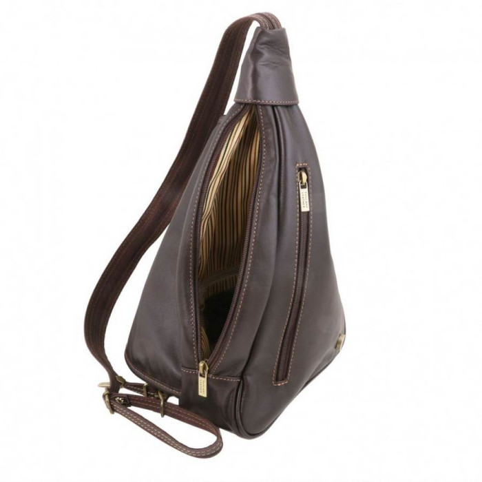 Невероятный вкус демонстрирует торговая марка Tuscany Leather в новом кожаном рюкзаке Hanoi. Модель исполнена из натуральной кожи Sauvage, внутри имеет хлопчатобумажную подкладку. Треугольный фасон – необычная находка итальянского производителя. Здесь присутствует боковой карман на застежке, а также пара мелких отделений для смартфона, ключей. Они застегиваются на магнитную кнопку. Модель закрывается клапаном с эффектной застежкой. В комплекте с изделием идет регулируемый плечевой ремень, с помощью которого легко переносить семидюймовые планшеты. Особенностью аксессуара является мягкая структура материала и никелированная фурнитура.