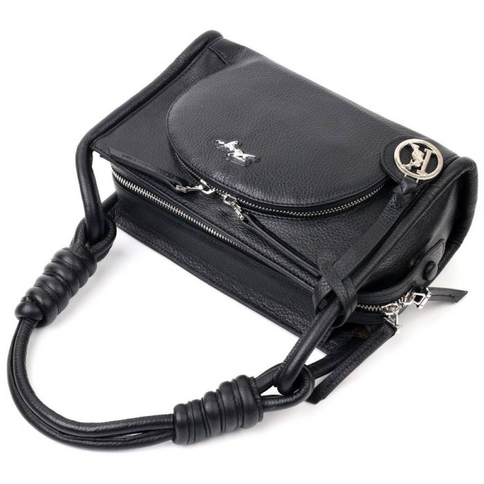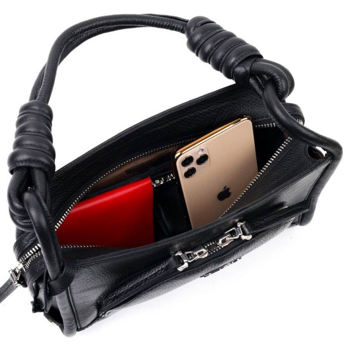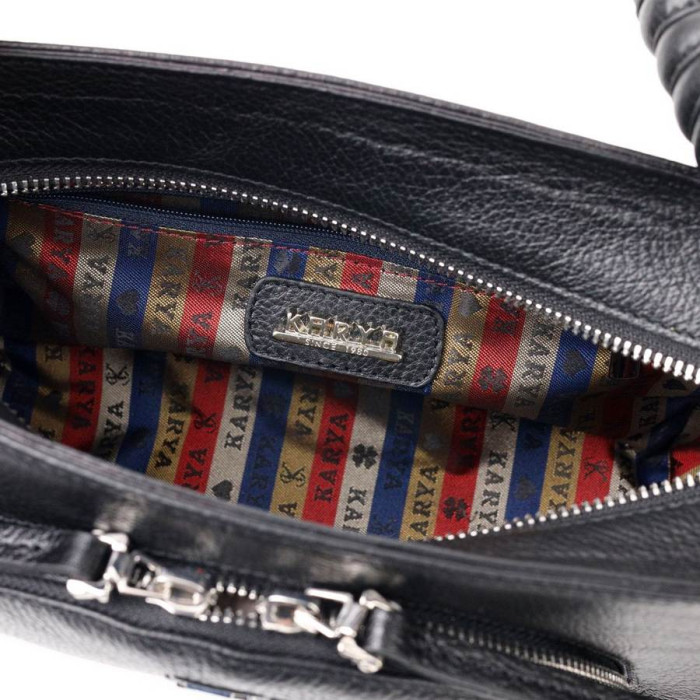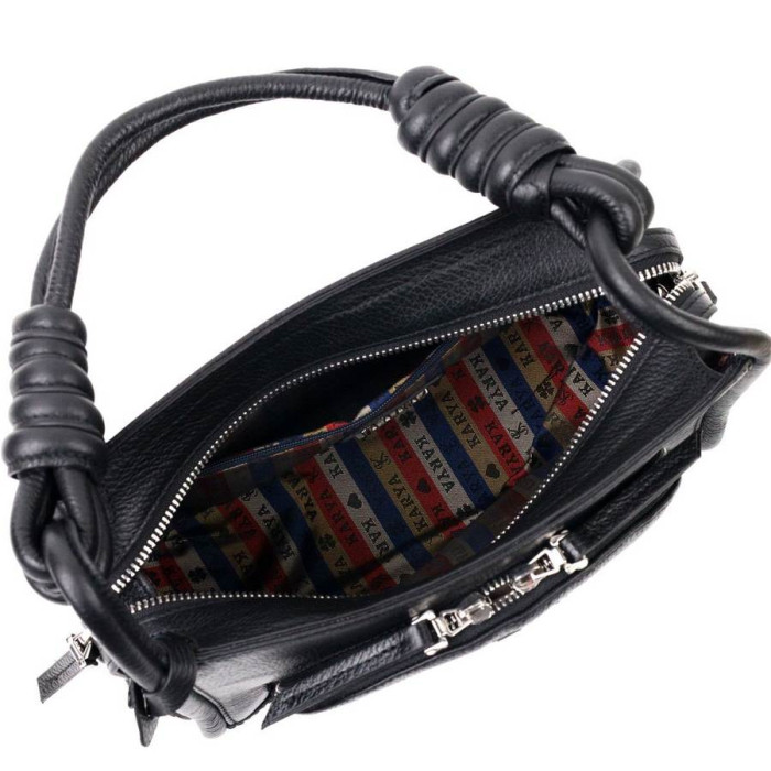 Компактная женская сумка из мелкозернистой натуральной кожи, в классическом черном цвете. Сумка функциональна и удобна в эксплуатации, в изделии использована качественная фурнитура и прочная подкладка. Аксессуар упакован в фирменный текстильный мешок Karya. Сумка из натуральной кожи всегда будет отличным подарком любой женщине.