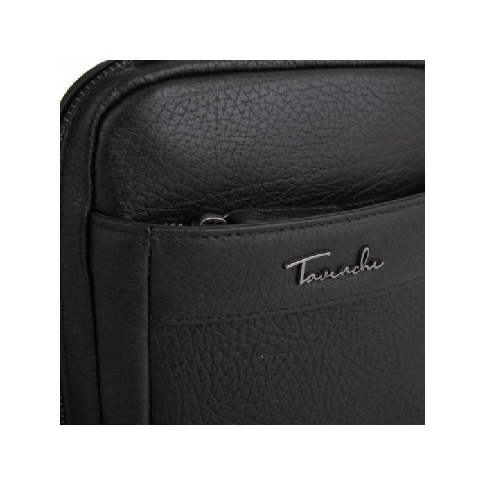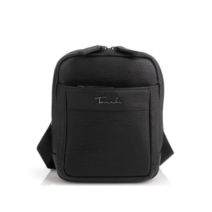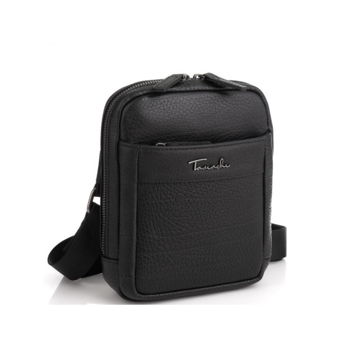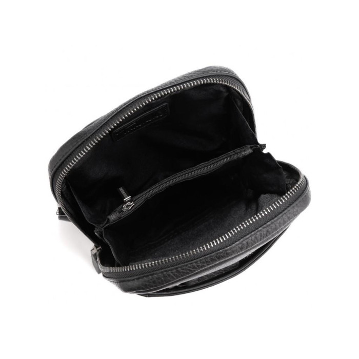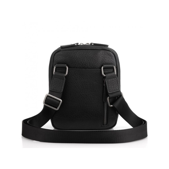 Черная кожаная сумка небольших размеров, сделана из натуральной итальянской кожи. Оснащена кожаными пуллерами, текстильным плечевым ремнем, который регулируется по длине, внутри сумки черная плотная подкладка. Кожаная сумка имеет одно основное отделение на молнии. С лицевой стороны карман на молнии, с тыльной стороны карман на магнитной кнопке, а также карман на молнии вертикального типа. Внутри сумки карман-перегородка на молнии.