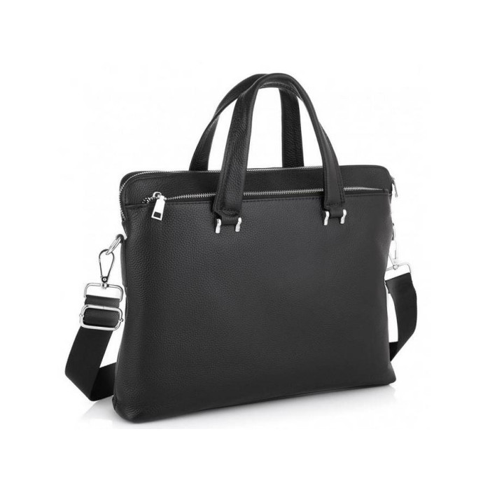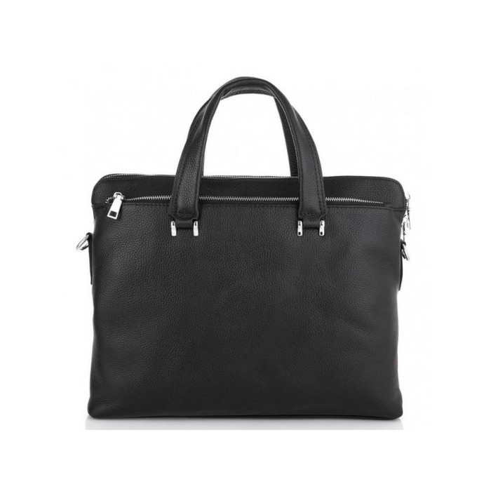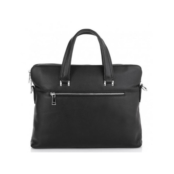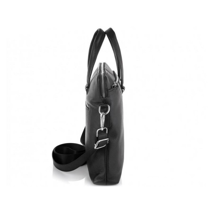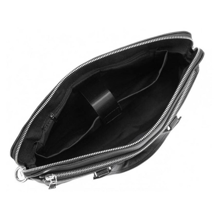 Черная мужская кожаная сумка для ноутбука, сделана из зернистой кожи. Для носки можно использовать кожаные ручки или же наплечный текстильный ремень. Внутри сумки плотная черная текстильная подкладка. Фурнитура - металлическая, надежная. Сумка для ноутбука имеет одно основное отделение на молнии, внутри которого есть отделение на липучке для ноутбука, а также карман открытого типа и карман на молнии. С тыльной стороны есть одно отделение на молнии.