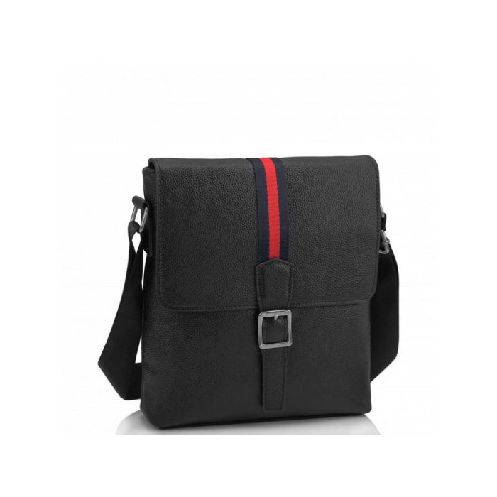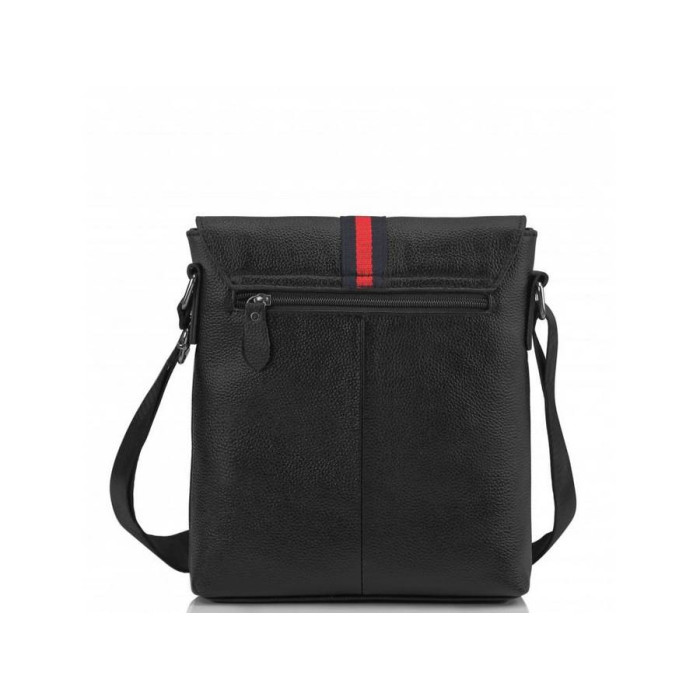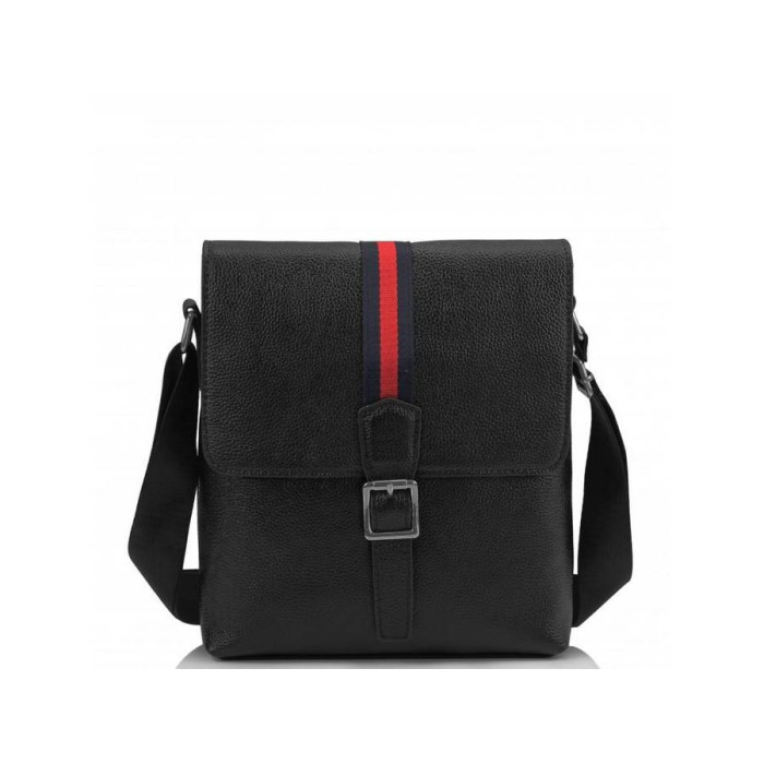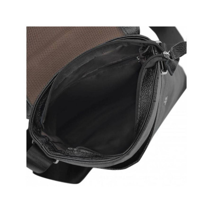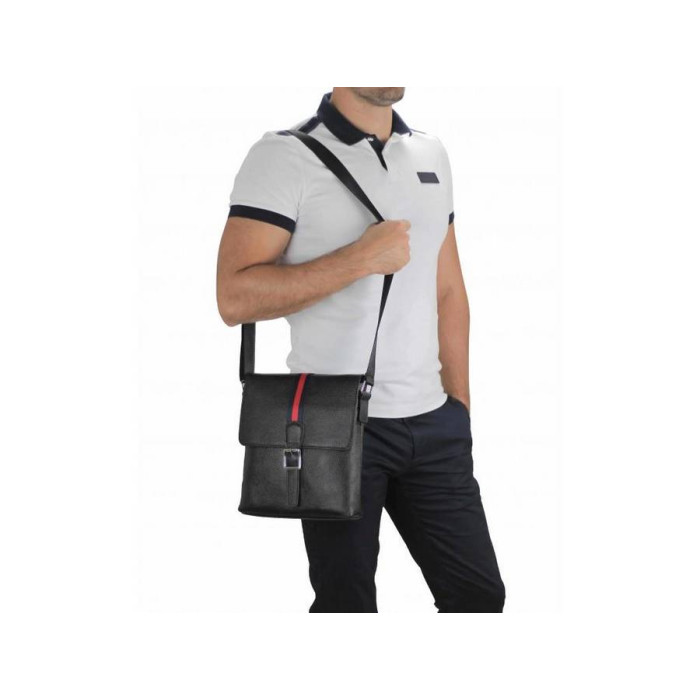 Наплечная мужская сумка вертикального типа с клапаном. Данная модель мужской сумки представлена в черном цвете. Сделана из натуральной кожи с зернистой фактурой. Для ношения есть ремень с прочного текстиля, который регулируется по длине. Верхний клапан сумки закрывается на три магнитные кнопки. Сумка на плечо имеет одно основное вместительное отделение, а также два дополнительных, одно с лицевой части и другое с тыльной части на молнии. Внутри сумки есть три маленьких отделения.