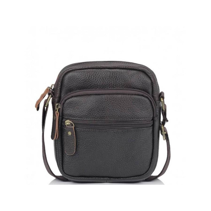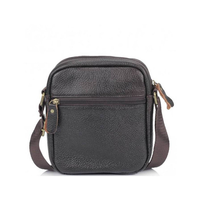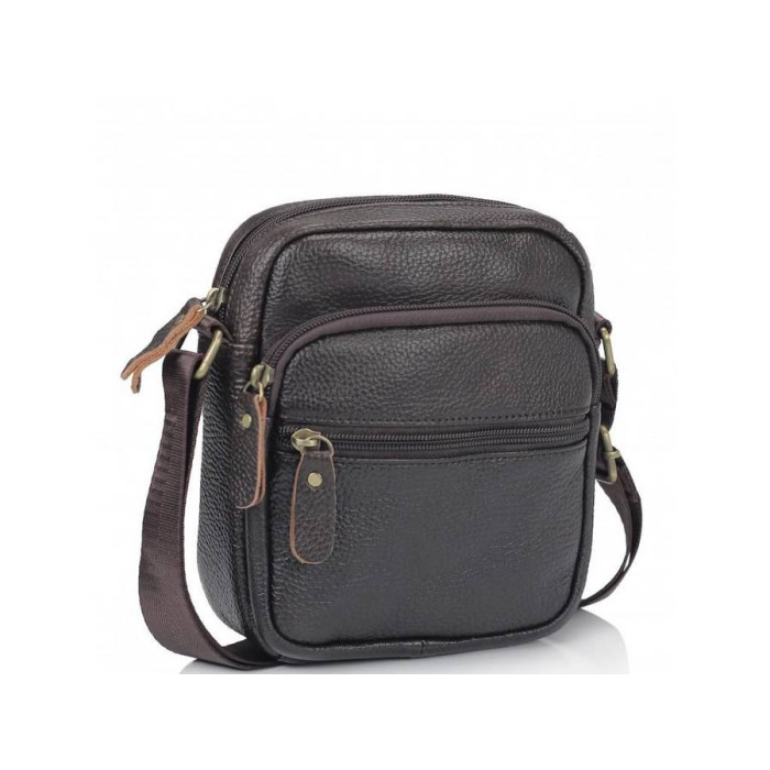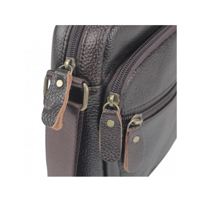 Небольшой мессенджер коричневого цвета выполненный с натуральной кожи зернистой структуры. Текстильный ремень регулируется по длине, фурнитура золотого цвета, пуллера кожаные. Внутри сумки - одно основное отделение и карман на замке. С лицевой стороны сумки - накладной карман на замке и маленький карман на замке, с тыльной - один карман на замке.