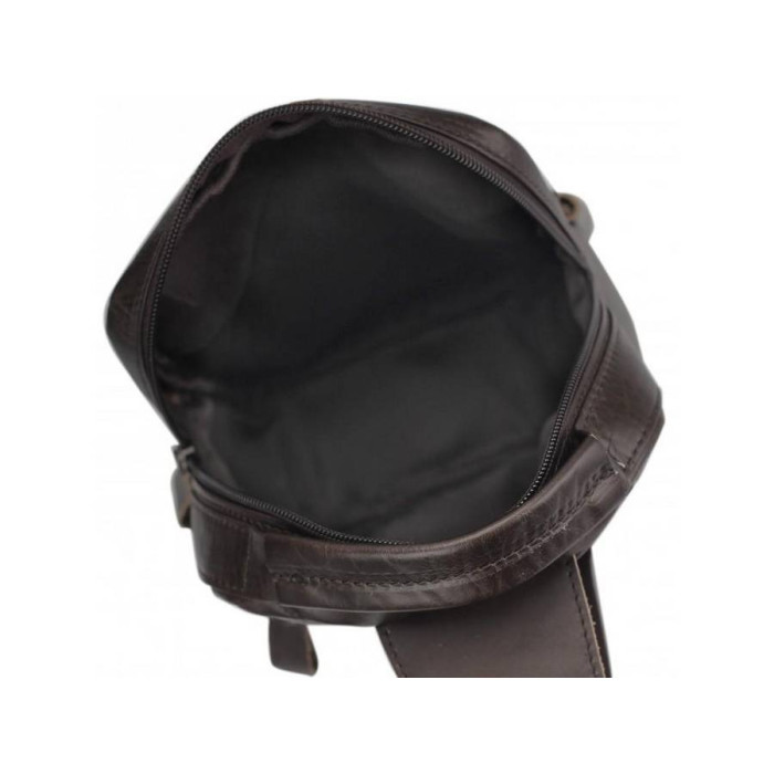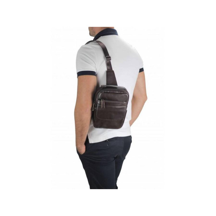 Мужская сумка-слинг разработана для повседневного использования. Сделана она с натуральной гладкой кожи и имеет темно-коричневый цвет. Оснащена одной шлейкой, такую мужскую сумку удобно носить через плечо. Мужская сумка имеет одно главное отделение, два кармана на молнии, один с лицевой стороны и один с тыльной. Также с лицевой стороны есть один небольшой карман, который закрывается кнопкой с магнитом. Внутри сумки есть один карман для мелочей.