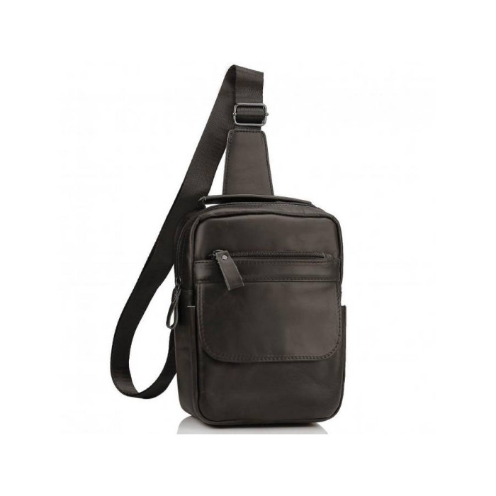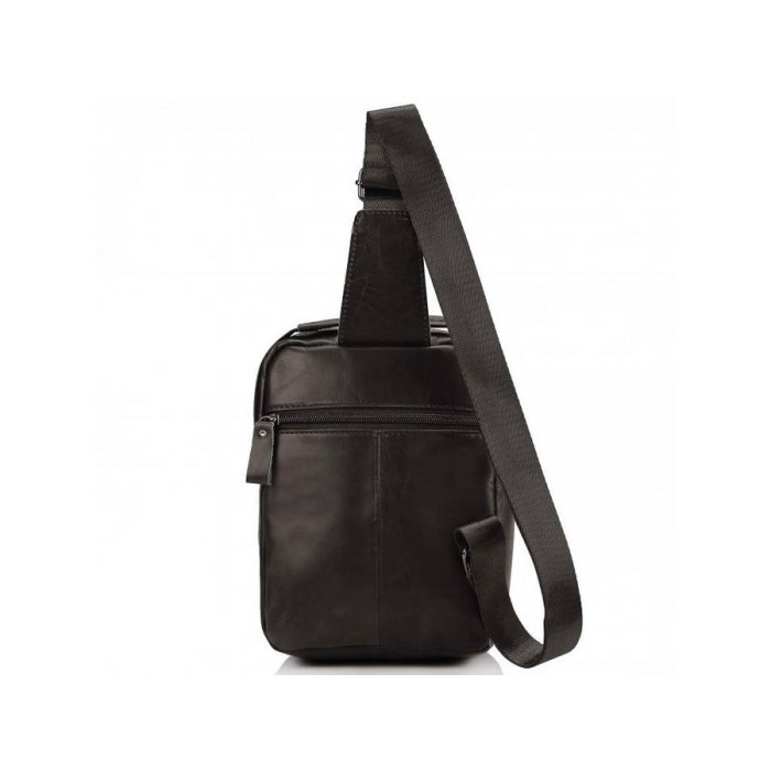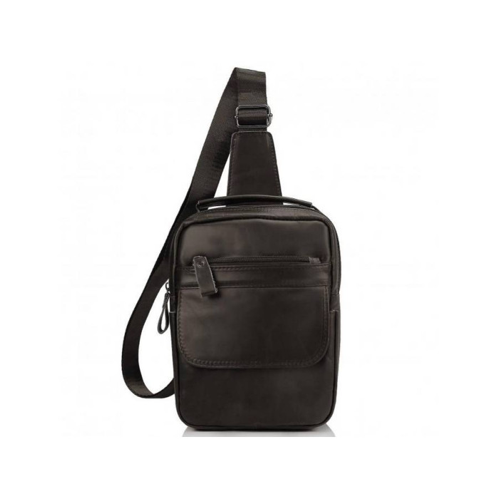 Мужская сумка-слинг разработана для повседневного использования. Сделана она с натуральной гладкой кожи и имеет темно-коричневый цвет. Оснащена одной шлейкой, такую мужскую сумку удобно носить через плечо. Мужская сумка имеет одно главное отделение, два кармана на молнии, один с лицевой стороны и один с тыльной. Также с лицевой стороны есть один небольшой карман, который закрывается кнопкой с магнитом. Внутри сумки есть один карман для мелочей.