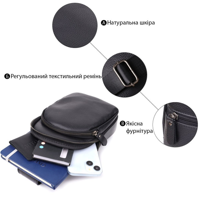 Кожаная сумка через плечо — практичный и стильный аксессуар на каждый день. Изготовлена из прочной зернистой кожи флотар, устойчива к износу и деформациям. Удобная организация внутреннего пространства: вместительное основное отделение на молнии, потайной карман и дополнительные отделения для мелочей. На лицевой стороне — накладной и встроенный горизонтальный карманы на молнии, на тыльной — еще один карман для быстрого доступа. Регулируемый текстильный ремень позволяет комфортно носить сумку через плечо, освобождая руки. Отличный выбор для тех, кто ценит качество и удобство в повседневных аксессуарах.