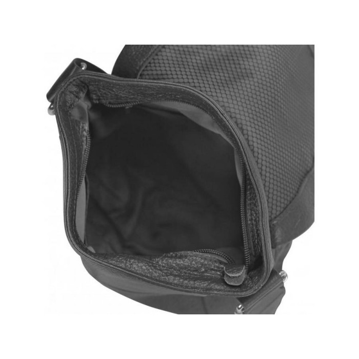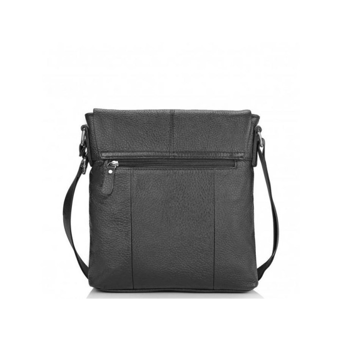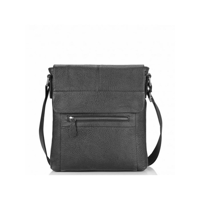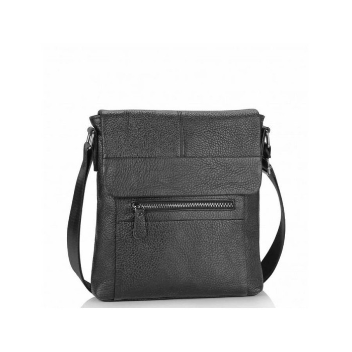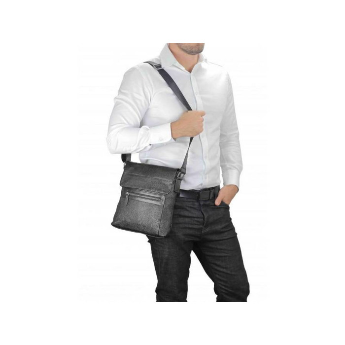 Мужская кожаная сумка через плечо черного цвета с зернистой текстурой. Имеет текстильный ремень который регулируется по длине, а также серебристую фурнитуру. Сумка имеет одно основное отделение, которое закрывается клапаном на двух магнитах. С лицевой стороны есть один маленький карман на молнии с тыльной стороны также карман на молнии. Внутри сумки карман на молнии и два кармана открытого типа.