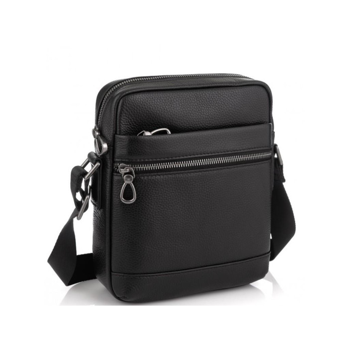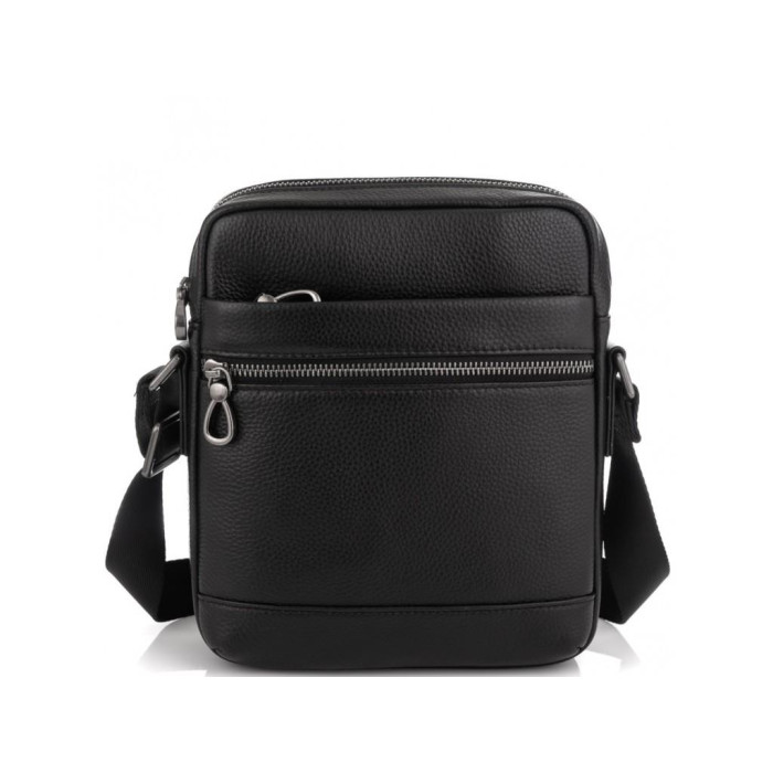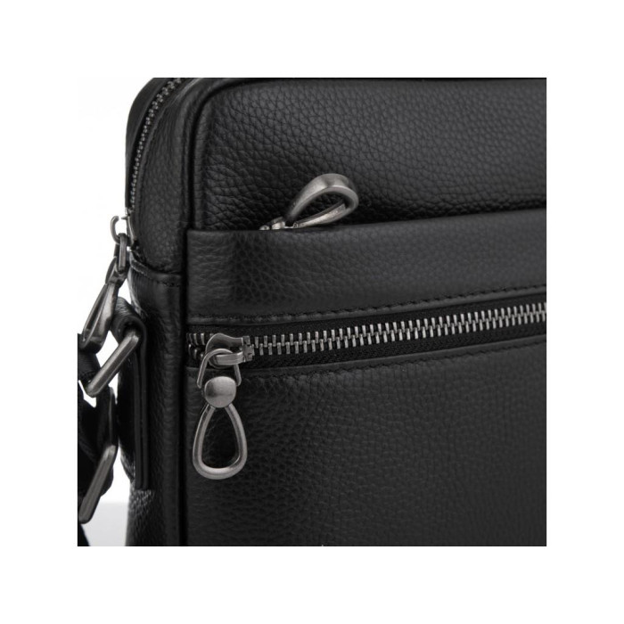 Классическая кожаная мужская сумка в зернистой коже. Для носки предусмотрен плечевой ремень, который регулируется по длине. Фурнитура металлическая, надежная. Внутри сумки черная, текстильная, плотная подкладка. Мужская сумка имеет одно основное отделение в котором есть карман на молнии и карман открытого типа. С лицевой стороны два кармана на молнии с тыльной стороны, также есть карман на молнии.
