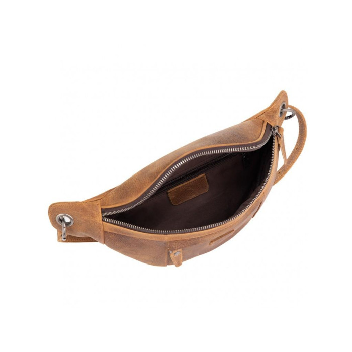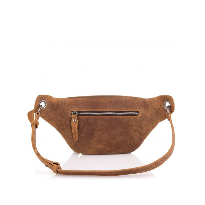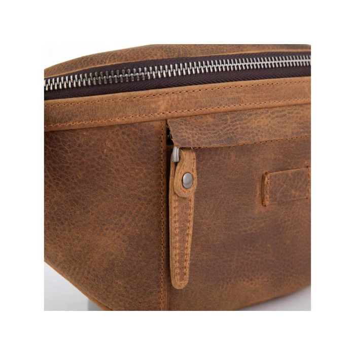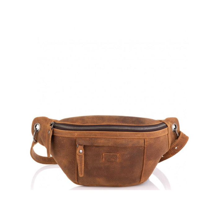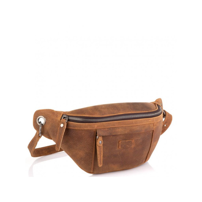 Поясная сумка из винтажной кожи коричневого цвета. Сумка имеет кожаный ремень и качественную стальную фурнитуру. Внутри сумки одно основное отделение и маленький карман на замке. С лицевой стороны - один карман на замке, с тыльной стороны - еще один карман на замке.