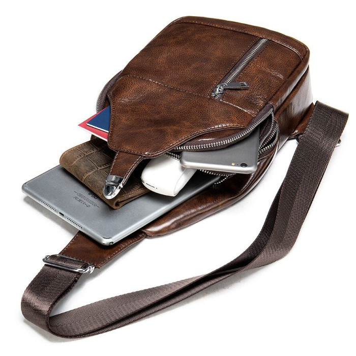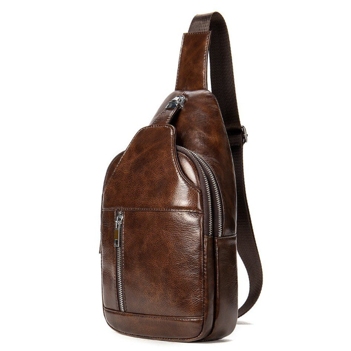 Мужская легкая и универсальная сумка через плечо из плотной и гладкой натуральной кожи коричневого цвета станет безупречной находкой для любого мужчины. Модель очень популярная на нашем сайте. Сумка обладает стильным дизайном и отменным функционалом. Модель компактного размера идеально подойдет на каждый день. Такая сумка с легкостью заменит вам барсетку и бананку. Сумка слинг – самая популярная модель этого года. Изделие станет отличным подарком для близкого человека. В комплекте идет текстильный чехол.