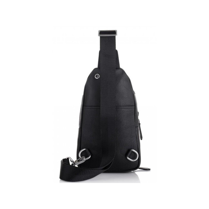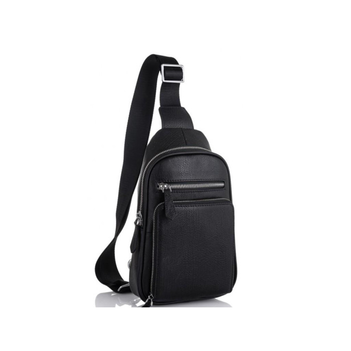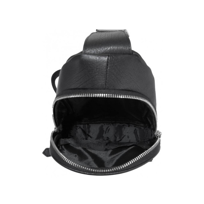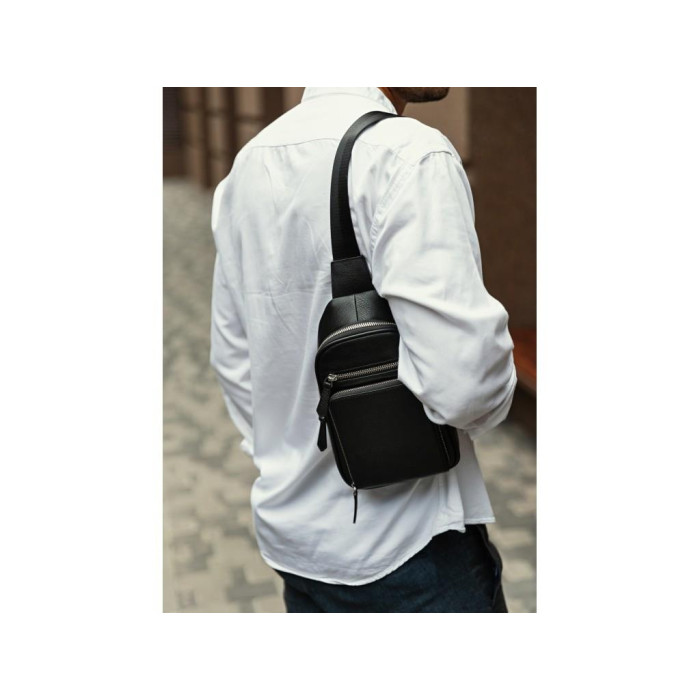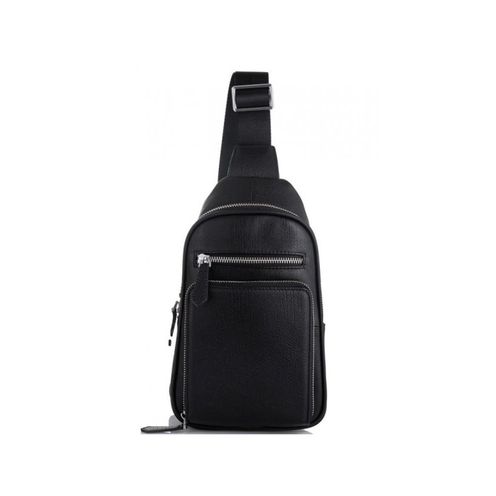 Мужской кожаный рюкзак на одну шлейку с одним основным отделением. С лицевой части объемный накладной карман квадратной формы. Фурнитура серебристого цвета. Кожаные пуллеры на бегунках молний. Текстильная наплечная шлейка регулируется по высоте и может перестегиваться на левую или правую сторону. Сумку можно носить на одном плече, через плечо или груди.