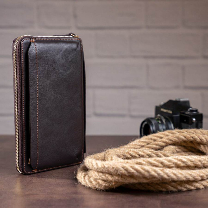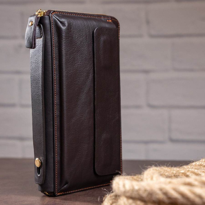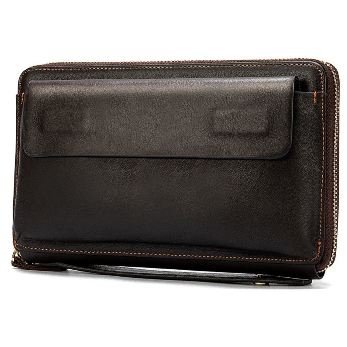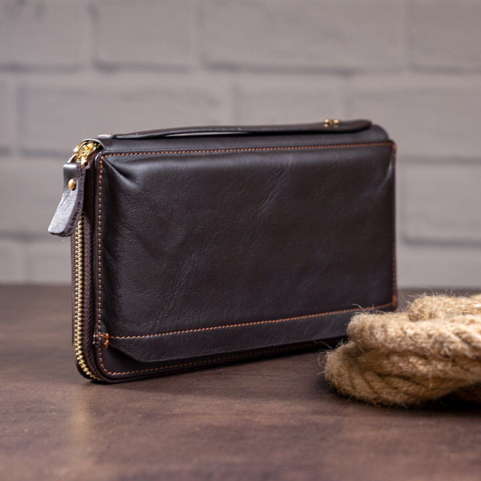 Суперстильная барсетка для мужчин. В барсетку вы можете положить все самое необходимое и все будет под рукой. Внизу аксессуара есть ремешок для носки на руке, что очень удобно в использовании. Кожа мягкая на ощупь. Фурнитура в клатче золотистого цвета. По краям аксессуар прошит коричневой нитью. В барсетку можно поместить свой телефон, чтоб не мешал в руках.