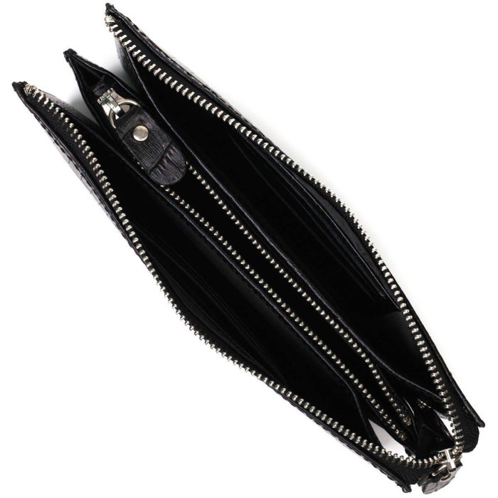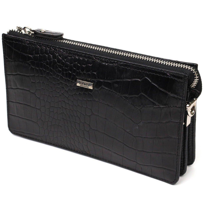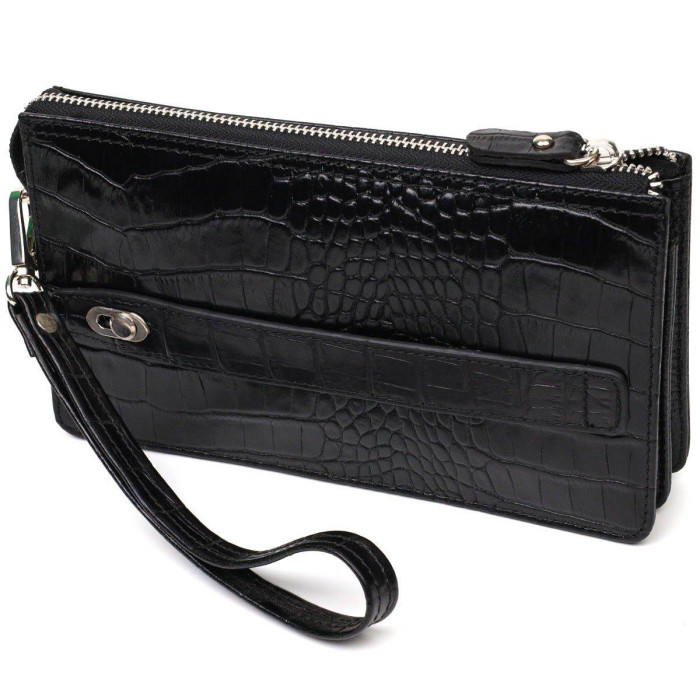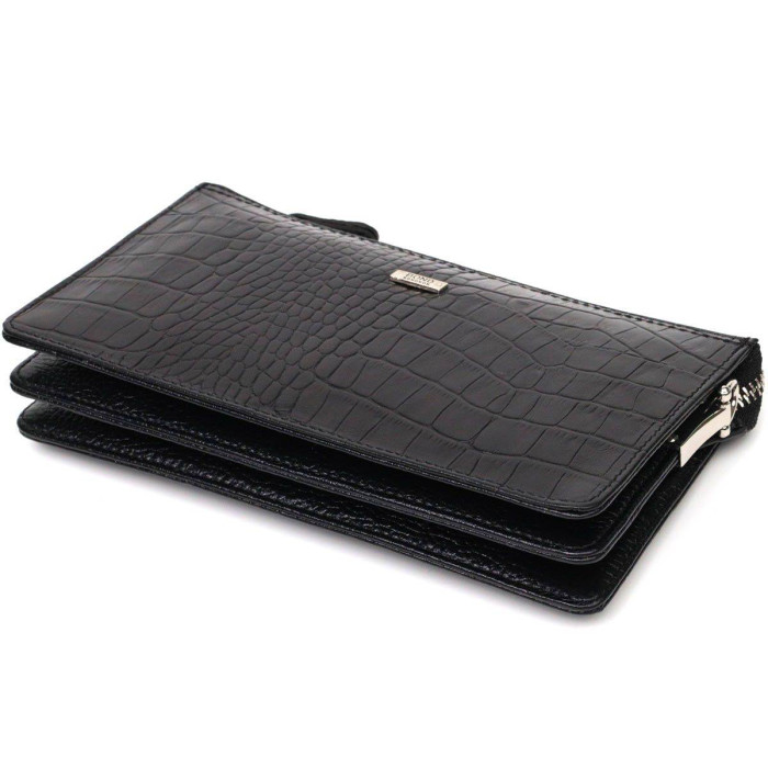 Превосходный мужской клатч из натуральной кожи с тиснением под крокодила, закрывается изделие на молнию, внутри можно без проблем размещать бумажные банкноты, банковские карты и даже смартфон. Аксессуар состоит из двух отделений для купюр, двух прилегающих карманов, шести слотов для кредиток и монетницы на молнии. Имеется также ручка для ладони на тыльной стороне клатча и съемный кистевой ремень. Продается клатч в красивой коробке от производителя. Качественный и надежный клатч - именно такой аксессуар должен быть у каждого уважающего себя человека.