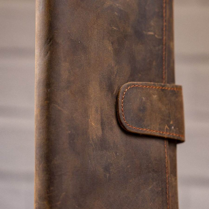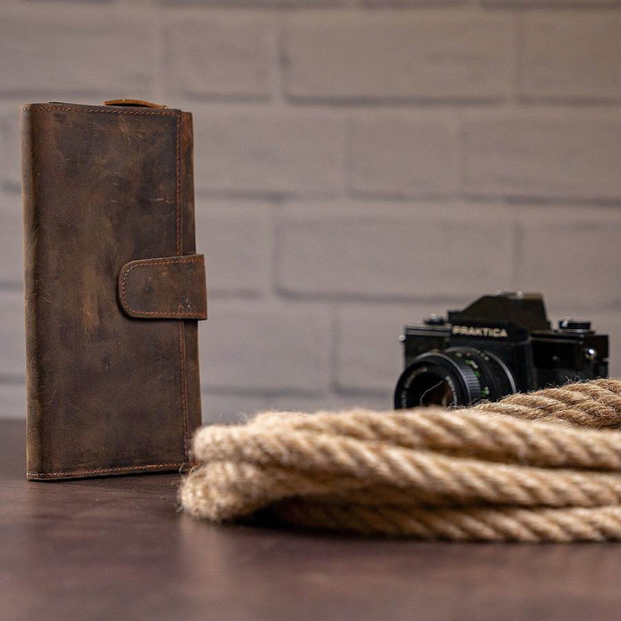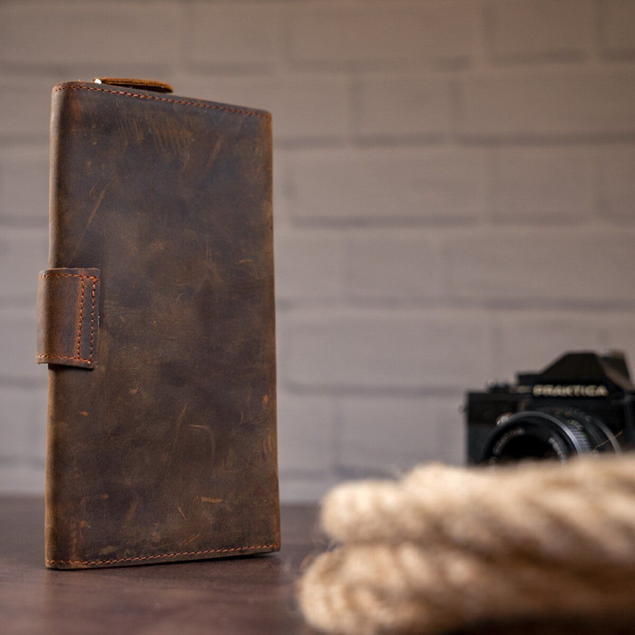 Клатч отшит из 100% натуральной винтажной кожи, с использованием дорогого текстиля (внутренние элементы), качественной нити и фурнитуры цвета золота.