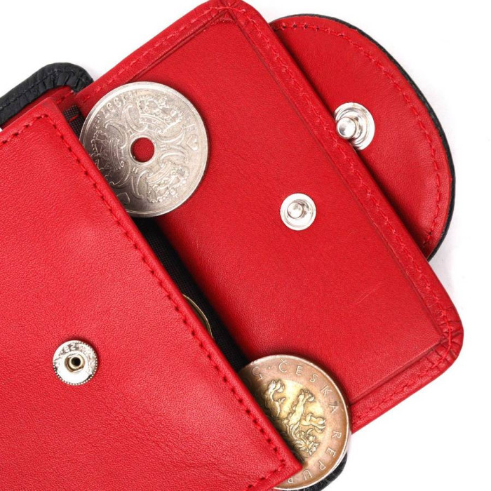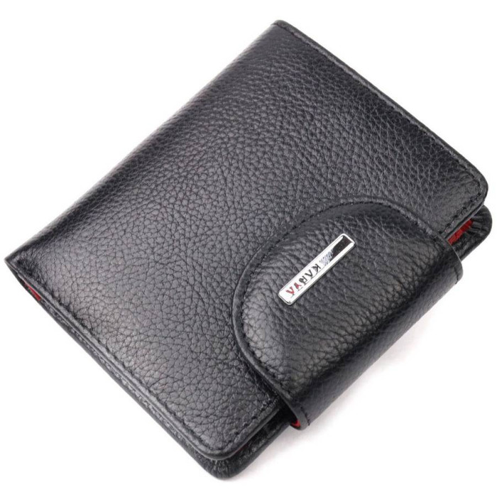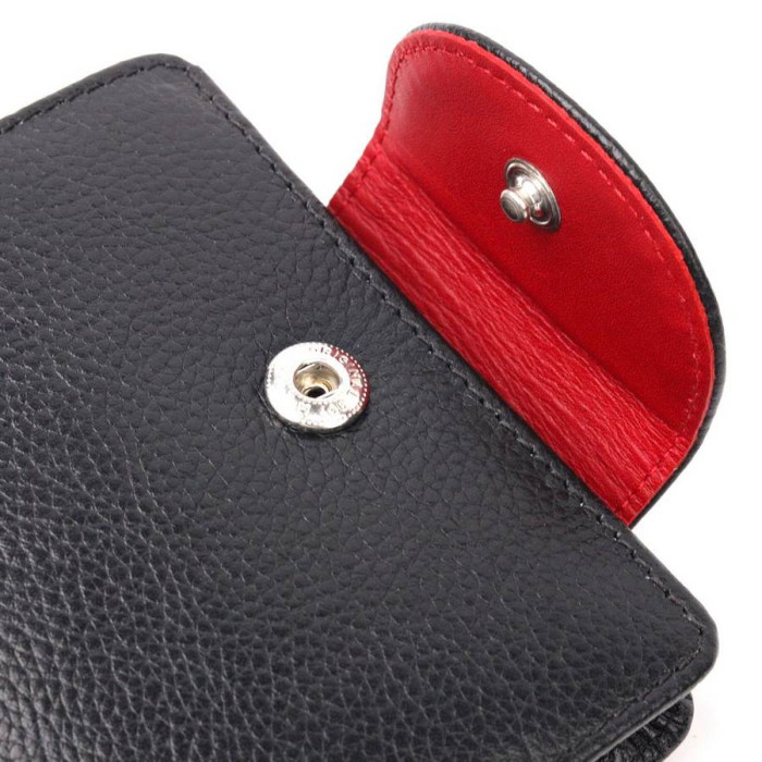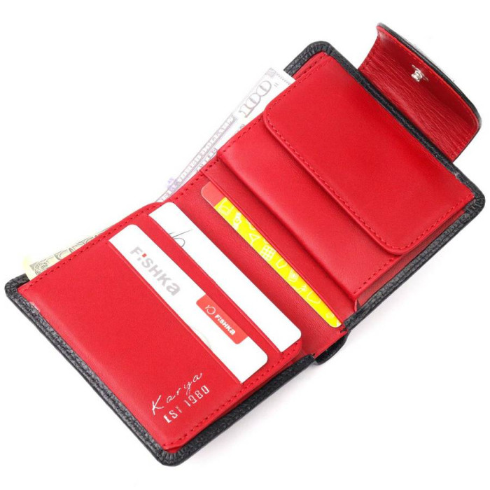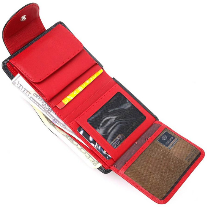 Классический женский кошелек из натуральной кожи черный снаружи и красный внутри. Складывается аксессуар пополам, закрывается клапаном на кнопку. Качественная фурнитура дополняет и украшает изделие. Такой кошелек из натуральной кожи - это идеальный вариант на каждый день для тех, кто ценит качество, удобство и комфорт, а также будет отлично дополнять Ваш повседневный образ. Упакован аксессуар в фирменную коробку и пакет бренда. Изделия из натуральной кожи всегда будут отличным подарком для близкого человека.
