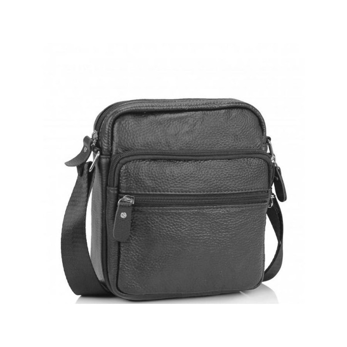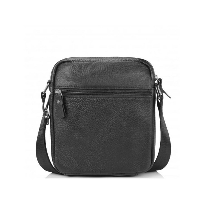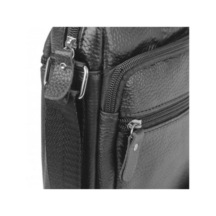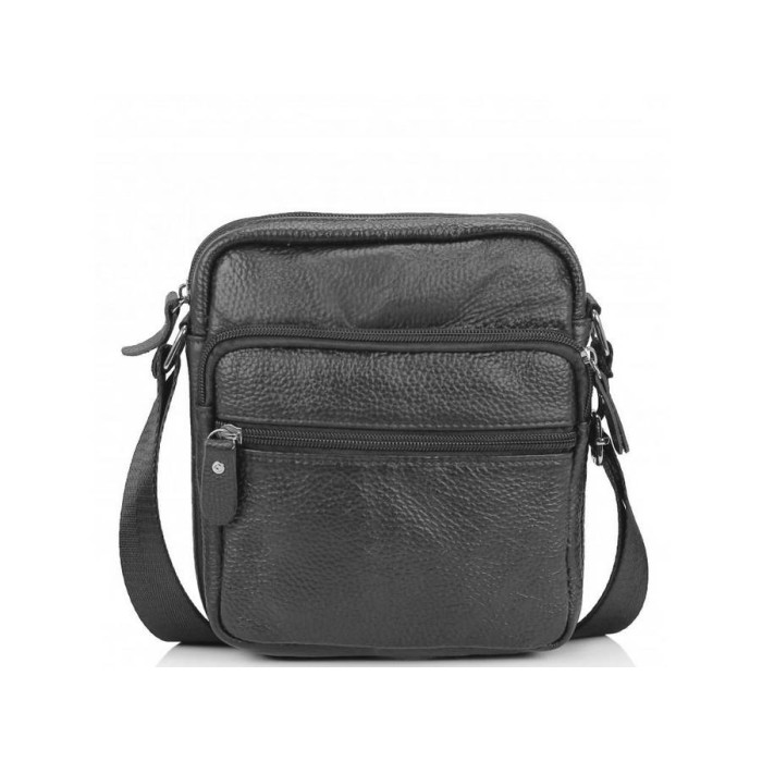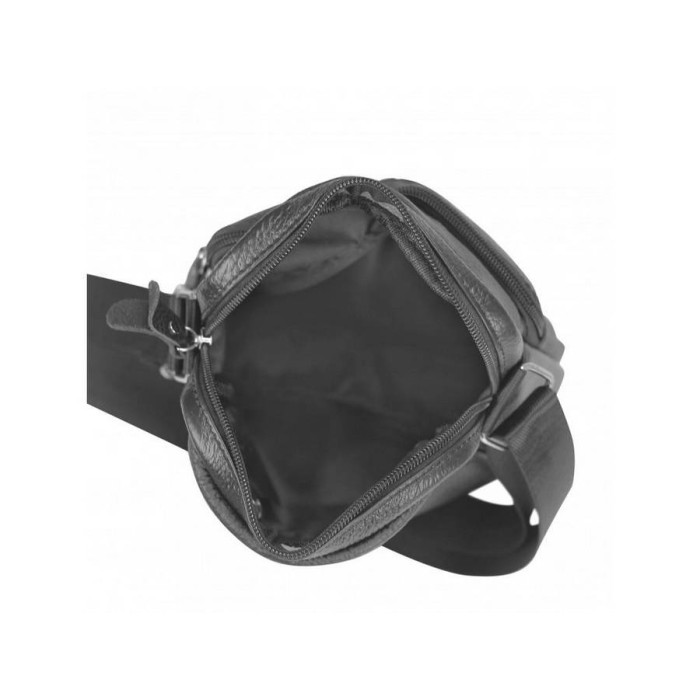 Удобная сумка-мессенджер черного цвета сделана с натуральной кожи зернистой структуры. Текстильный ремень регулируется по длине, фурнитура серебряного цвета, пуллера кожаные. Внутри сумки - одно основное отделение и карман на замке. С лицевой стороны сумки - накладной карман на замке и маленький карман на замке, с тыльной - один карман на замке.