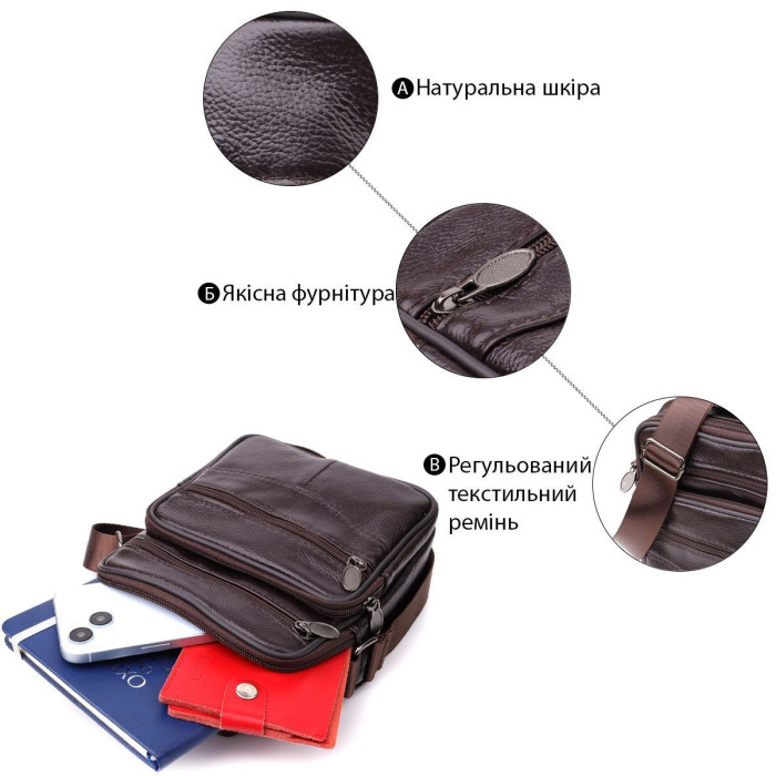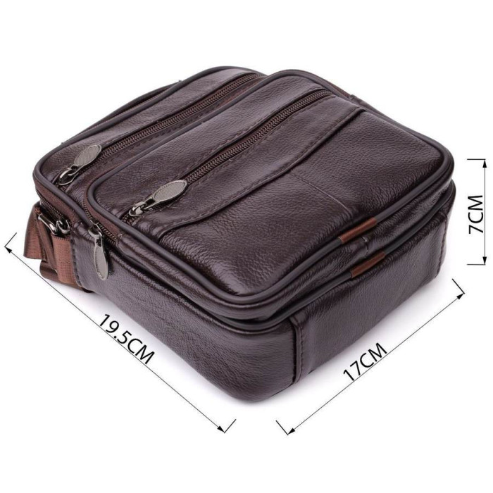 Удобная мужская сумка из высококачественной натуральной кожи, устойчивая к износу и мелким повреждениям. Модель оснащена одним вместительным основным отделением и четырьмя дополнительными карманами, которые обеспечивают удобное хранение аксессуаров, документов, телефона и других необходимых вещей. Регулируемый плечевой ремень выполнен из прочного текстиля, что гарантирует комфорт при носке, а также позволяет подобрать оптимальную длину. Короткая ручка делает сумку удобной для переноски в руке. Красивый коричневый цвет придаёт модели универсальности и стиля, делая её отличным выбором на каждый день — как для деловых встреч, так и для повседневного использования.