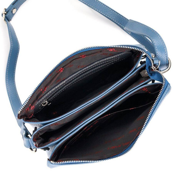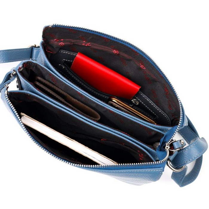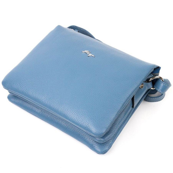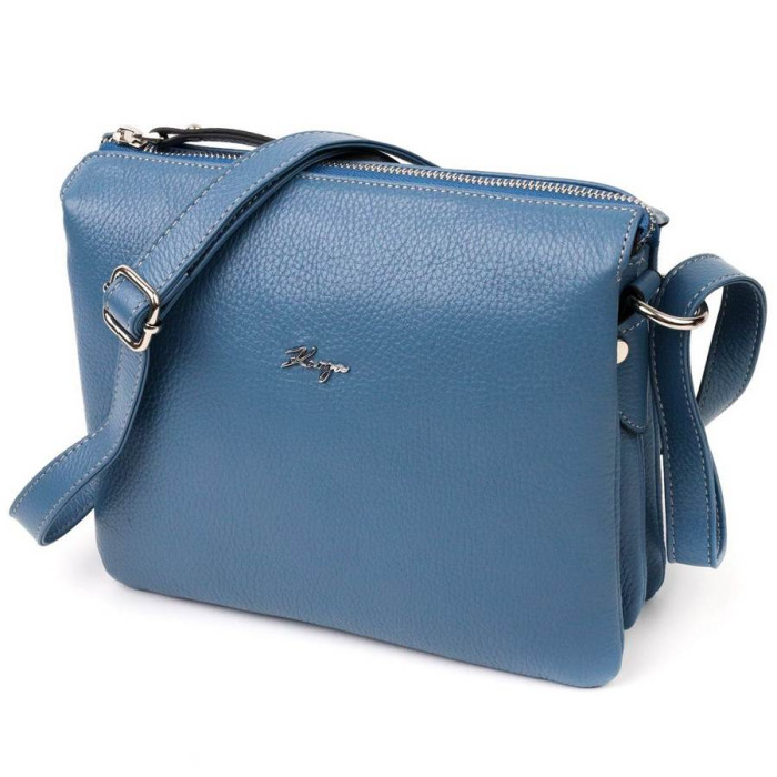 Женская компактная сумка небольшого размера из натуральной кожи, в красивом голубом цвете. Фурнитура серебряного цвета. Сумку удобно носить на плече или через плечо. Сумка упакована в фирменный текстильный чехол Karya. Сумка из натуральной кожи всегда будет отличным подарком любой женщине.