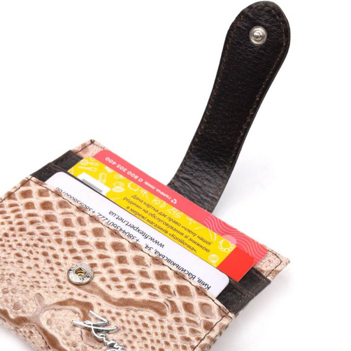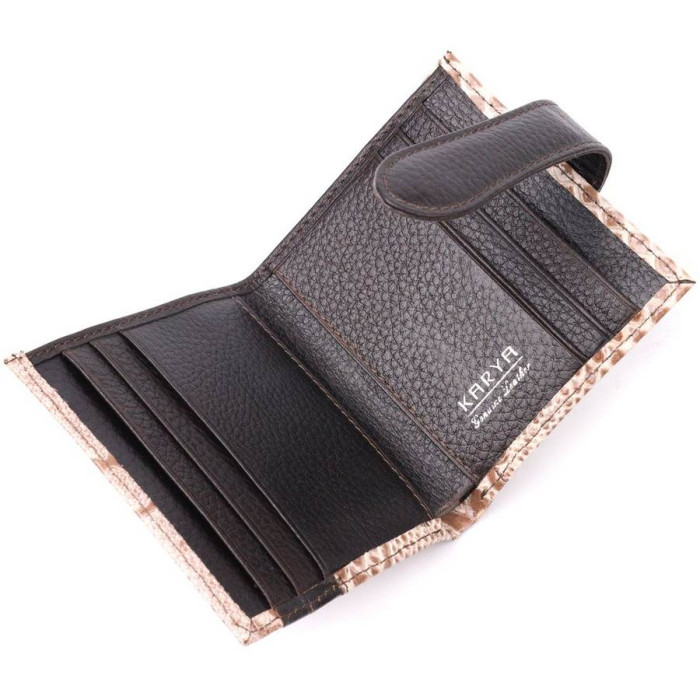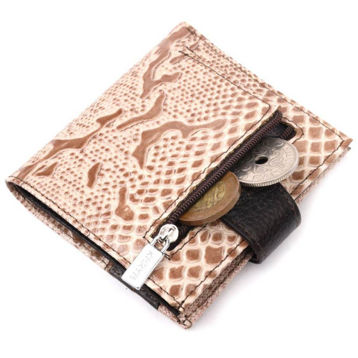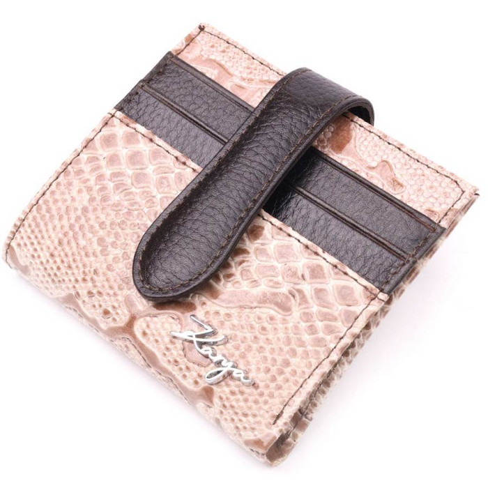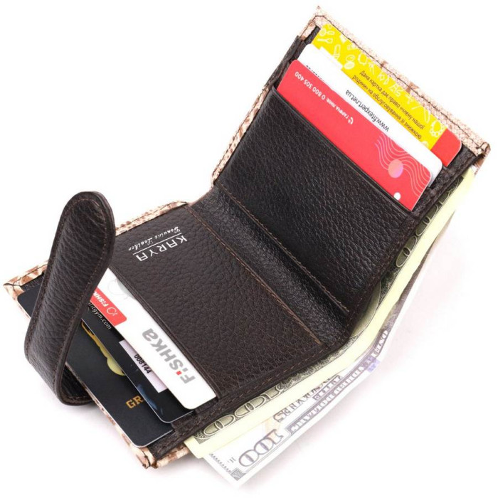 Вместительный небольшой женский кошелек из натуральной комбинированной кожи, классической зернистой коричневого цвета и лакированной бежевого цвета с тиснением под кобру. Внутри есть отделения для купюр и ячейки для кредитных карт. В изделии использована качественная фурнитура, а также прочная фирменная подкладка. Не большой кожаный кошелек поместится даже в самую маленькую сумочку. Закрывается модель на кожаный хлястик с кнопкой. Такой кошелек, однозначно, порадует любую женщину.