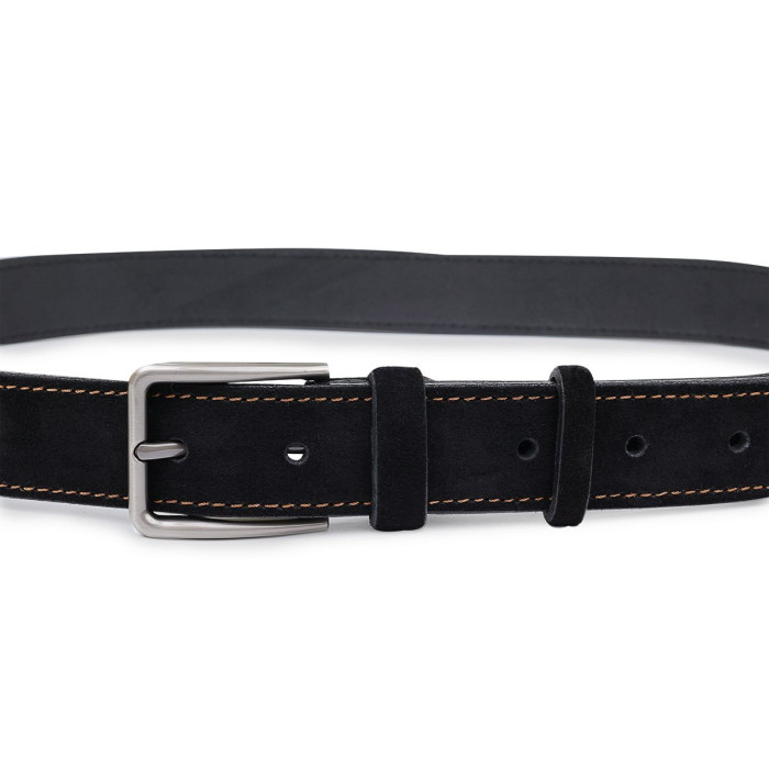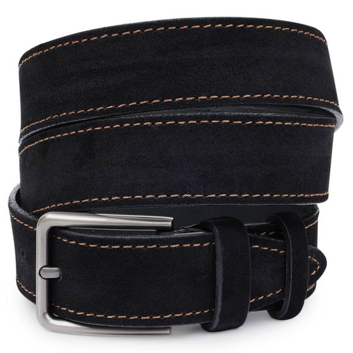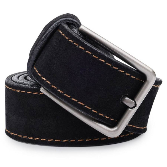 Красивый замшевый ремень от известного украинского производителя. Имеет насыщенный черный цвет и светло-коричневые строчки по краям. Материал изготовления – натуральная кожа высокого качества и стойкости к повреждениям. Пряжка ремня имеет простой и лаконичный дизайн с классическим механизмом.