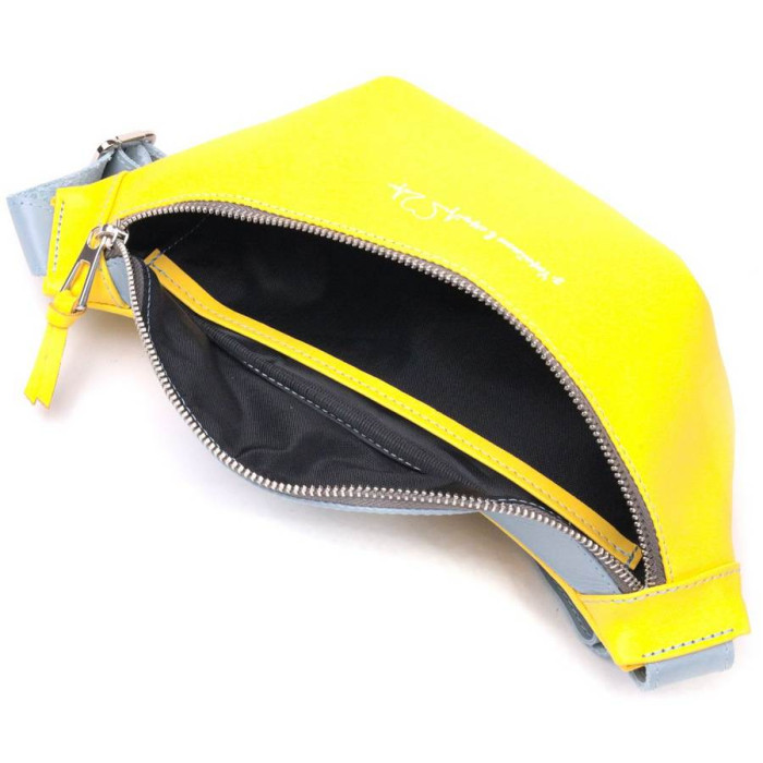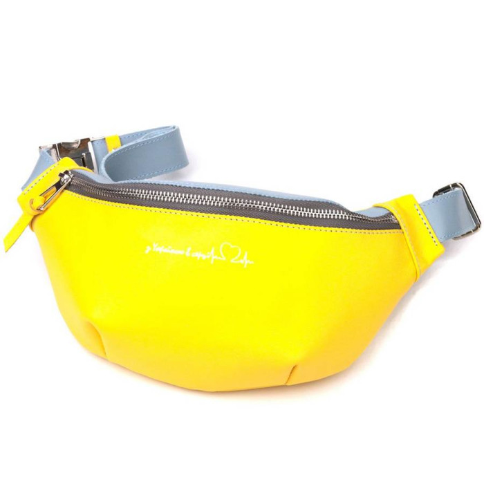 Патриотическая сумка бананка для мужчин и женщин из натуральной гладкой кожи, в комбинации двух цветов – желтого и голубого, и белой надписью “З Україною в серці”. Поясная сумка бананка очень функциональная и практичная, с такой сумкой все важные вещи будут при вас и при этом ваши руки будут свободны. Идеальный вариант сумки в дорогу. Бананку вы можете носить несколькими способами на груди, на поясе и на спине. Изделие станет прекрасным подарком для ваших близких. В комплекте идет фетровая сумка чехол.