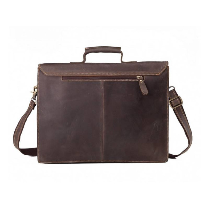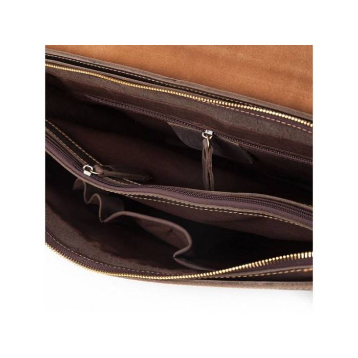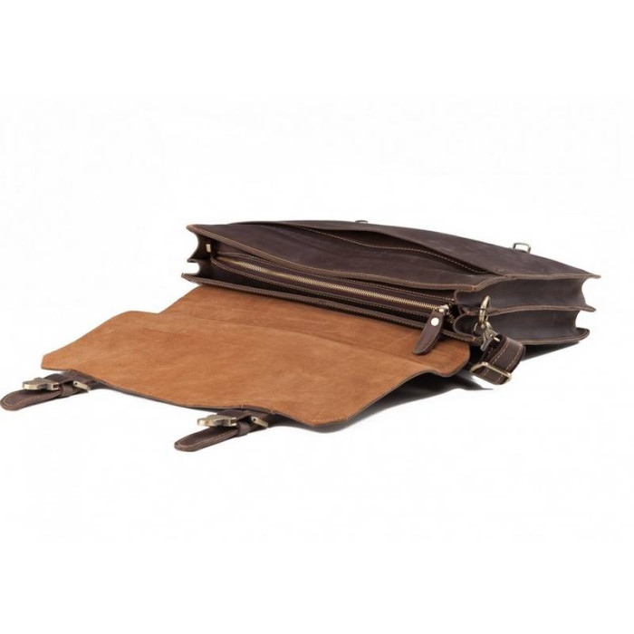 - коричневый портфель получил красивый откидной клапан с двумя ремнями на специальных защелках, под которым разместился открытый отсек для быстрого доступа и главное отделение на змейке;