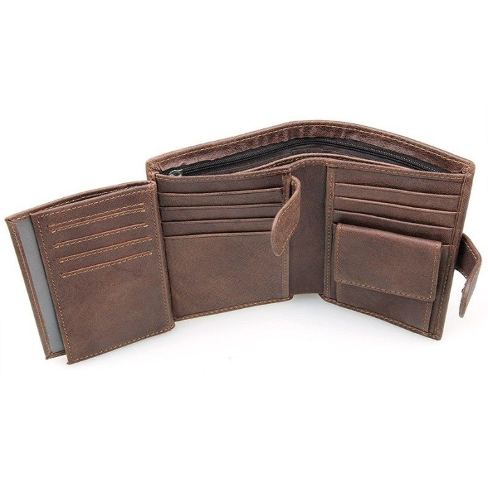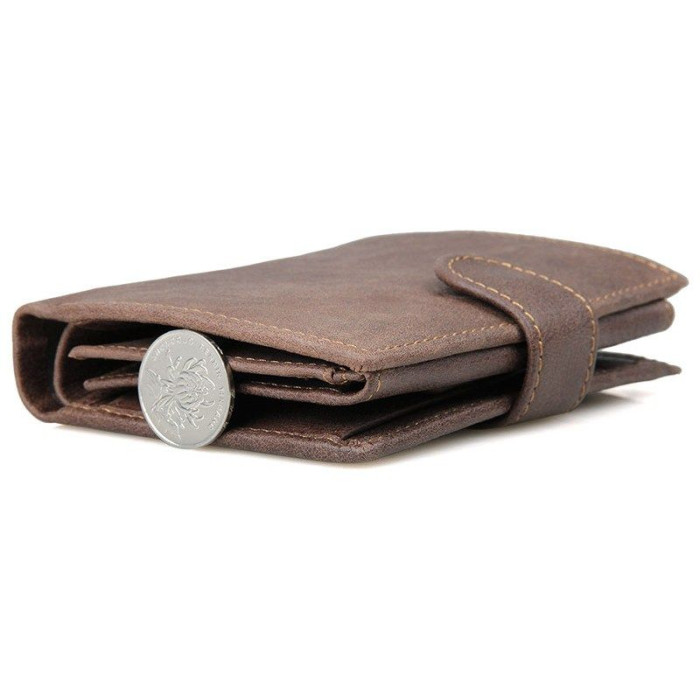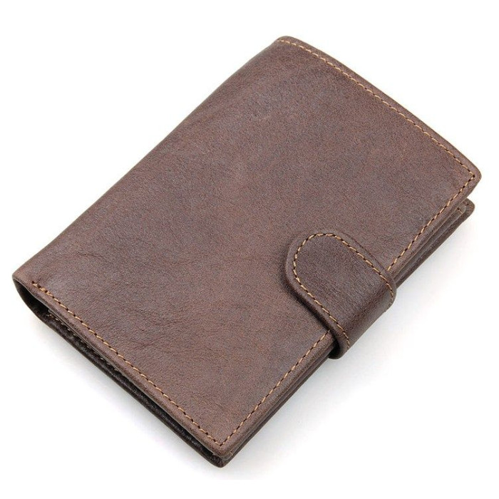Оригинальный мужской кожаный бумажник коричневого цвета. Кошелек надежно прошит светло-коричневой нитью. Аксессуар удобно держать в руке, но в передний карман джинсов он навряд ли поместится. Кошелек упакован в текстильный пылезащитный мешочек белого цвета.