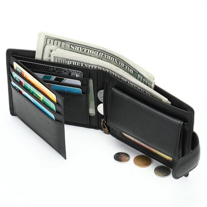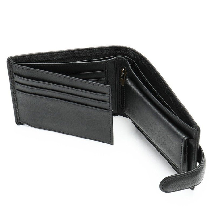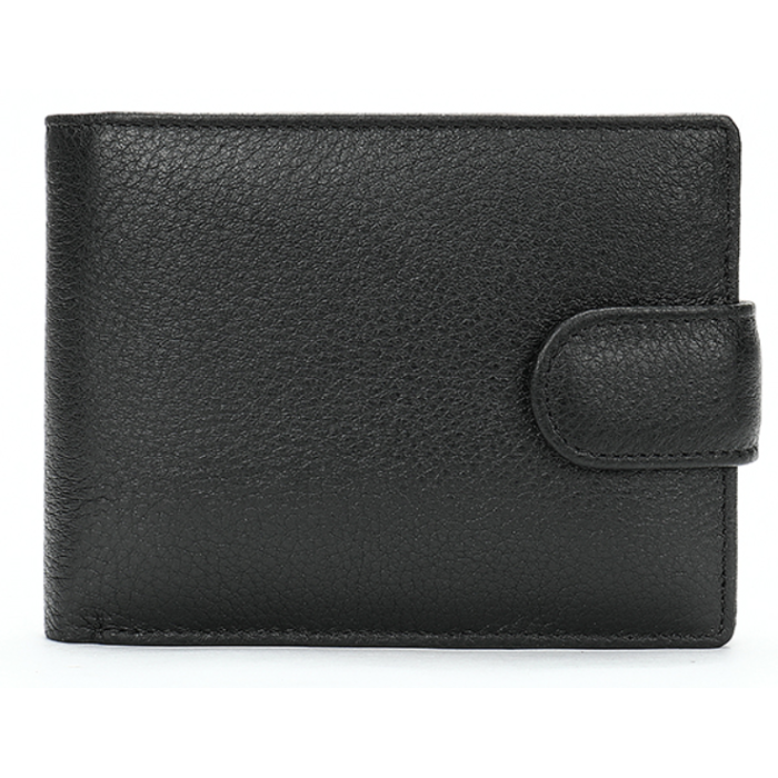 Простой и классический бумажник. Портмоне закрывается на кожаный хлястик с кнопкой. Модель имеет минимальный размер и легко поместится в карман брюк. Аксессуар упакован в тканевый пылезащитный чехол. Кошелек будет прекрасным и незаменимым подарком для любого мужчины.