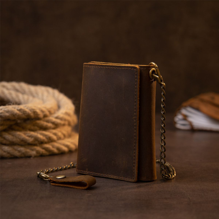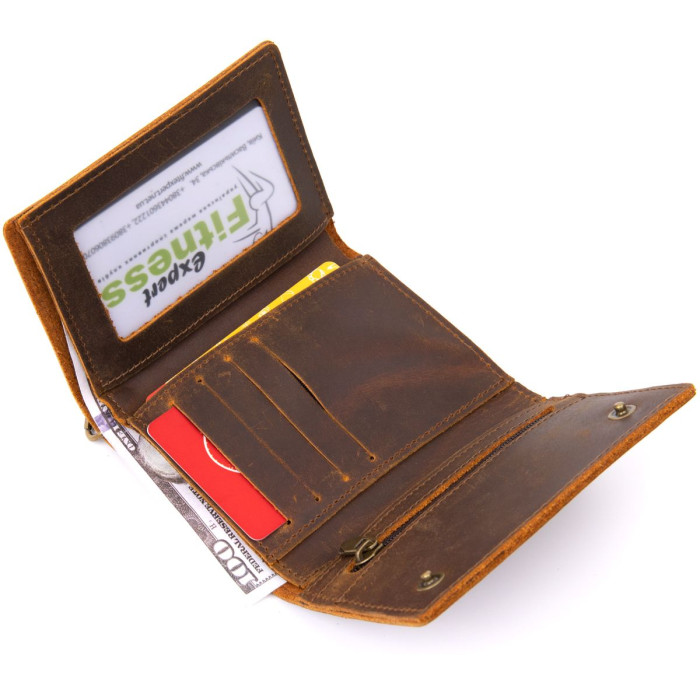Тонкое компактное матовое портомне из натуральной кожи с двумя кнопками. Изделие имеет коричневый насыщенный цвет и выполнено в винтажной коже. В процессе эксплуатации на поверхности винтажной кожи появляются потертости и царапины, которые создают эффект старины. Портмоне поместится в маленькую сумку или карман брюк. Кошелек станет прекрасным подарком для ваших близких. Портмоне имеет весь самый необходимый функционал. Кошелек очень приятный на ощупь. Подойдет для тех, кто не любит больших аксессуаров.