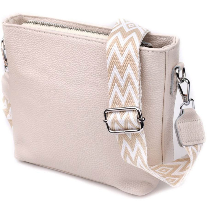 Белоснежный оттенок придаёт сумке утончённость и делает её идеальным дополнением как к повседневным, так и к более нарядным образам. Фурнитура серебристого цвета добавляет лёгкий блеск и подчёркивает изысканность аксессуара. Съёмный текстильный ремень обеспечивает комфортную посадку на плечо или через плечо, делая сумку практичной для активного городского ритма.