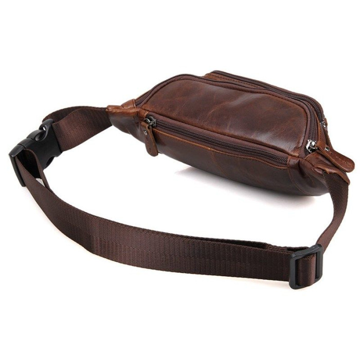 Сверхпрочная поясная кожаная сумка. Поясной ремень регулируется по длине и выполнен из прочного текстильного материала черно цвета. Цвет фурнитуры: темное серебро. Аксессуар аккуратно прошит темно-коричневой нитью. Сумка упакована в текстильный пылезащитный чехол белого цвета.