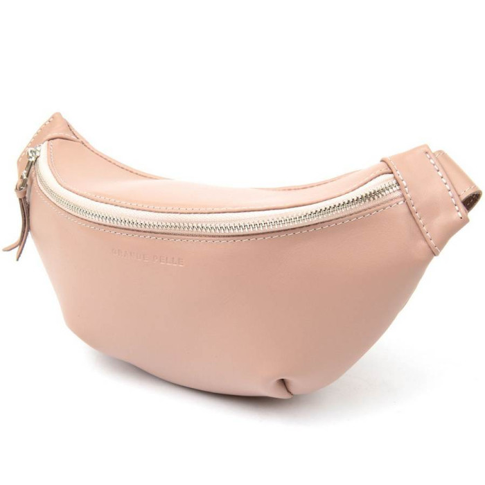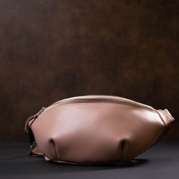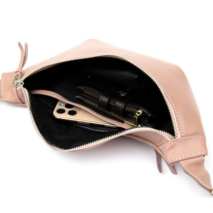 Практичная женская поясная сумка (бананка) из высококачественной натуральной кожи. Имеет просторное отделение и дополнительный карман на всю длину. На внешней задней стороне присутствует карман на молнии для быстрого доступа. Цвет изделия – нежно-розовый. Данное изделие станет отличным подарком на любой праздник.