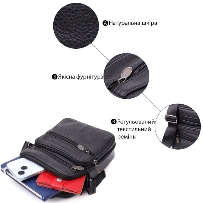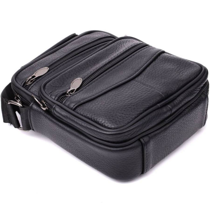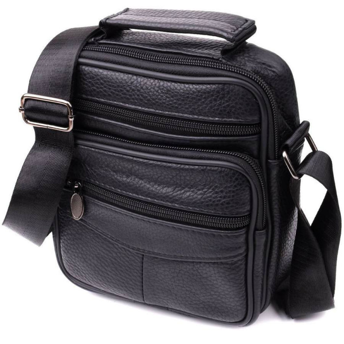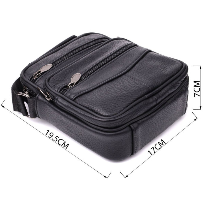 Компактная мужская сумка из высококачественной натуральной кожи, которая устойчива к различным повреждениям и износу. Имеет одно основное отделения и четыре дополнительных кармана для различных аксессуаров. Ремень выполнен из прочного текстиля и регулируется по длине. Классический чёрный цвет дополняет практичность модели и делает её отличным выбором на каждый день.