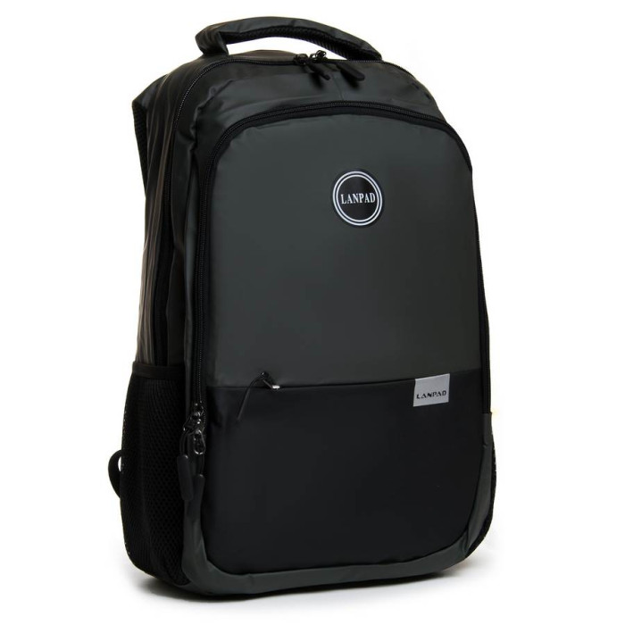 Рюкзак городской Lanpad. Изготовлен из материала с водоотталкивающим покрытием. Рельефная уплотненная спинка. Два отделения, закрываются на молнию. Внутри есть боковой открытый двойной карман и карман для ноутбука. На фасаде находится один карман на молнии, а на боковых стенках есть два кармана-сетки. Плечевые лямки регулируется по длине.