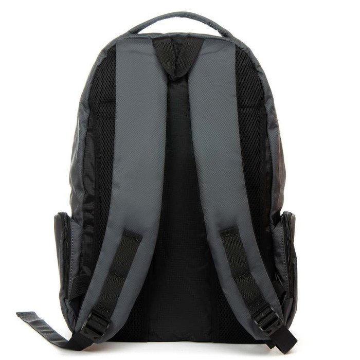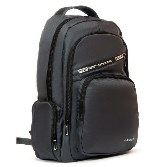 Рюкзак городской Lanpad. Изготовлен из материала с водоотталкивающим покрытием. Рельефная уплотненная спинка. Два отделения, закрываются на молнию. Внутри есть боковой открытый двойной карман и карман для ноутбука. На фасаде находится два кармана на молнии и на боковых стенках есть два кармана на молнии.