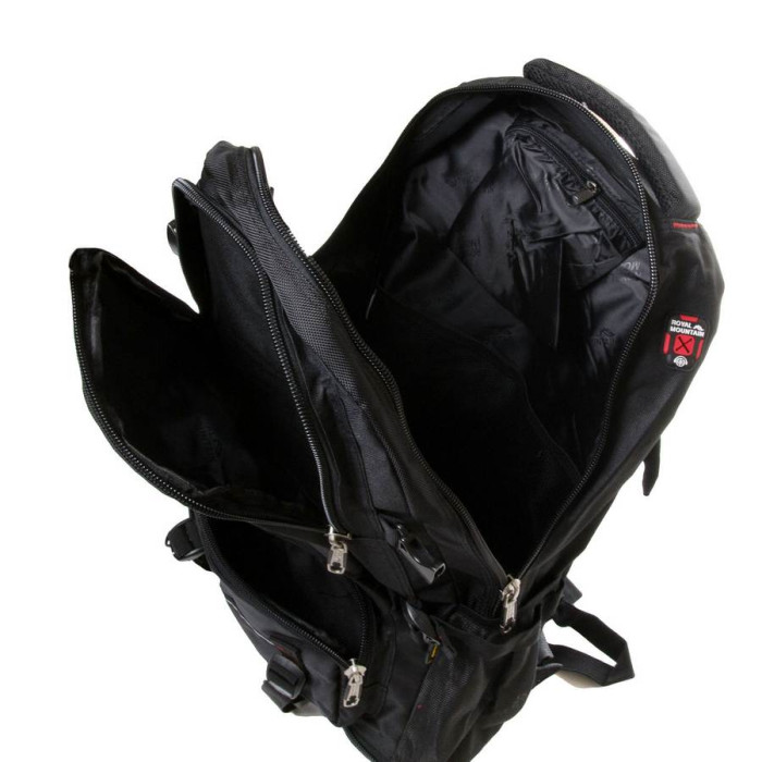 Туристический рюкзак "Royal Mountain". Уплотненная спинка. Одно основное отделение с карманом для ноутбука и карманом для смартфона. Отделение может увеличиваться в высоту на 10см. благодаря молнии расширения. На фасаде находятся два больших кармана на молнии, дополнительная ручка и светоотражающая полоса. На боковых сторонах рюкзака карманы-сетки для бутылок воды объемом 0,5 л. Плечевые лямки регулируются по длине и оснащены грудным ремнем-стяжкой.