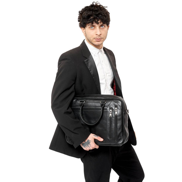 Функциональность. Снаружи спереди сумки накладной карман на молнии, и две вертикальные на молниях. На одной внутренней стенке - мягкий отдел под планшет, на противоположной стенке - один большой карман на молнии, и карман свободного доступа. Снаружи на спинке сумки большой карман на молнии.
