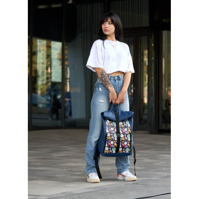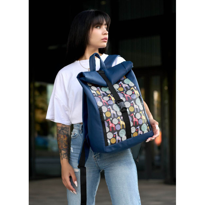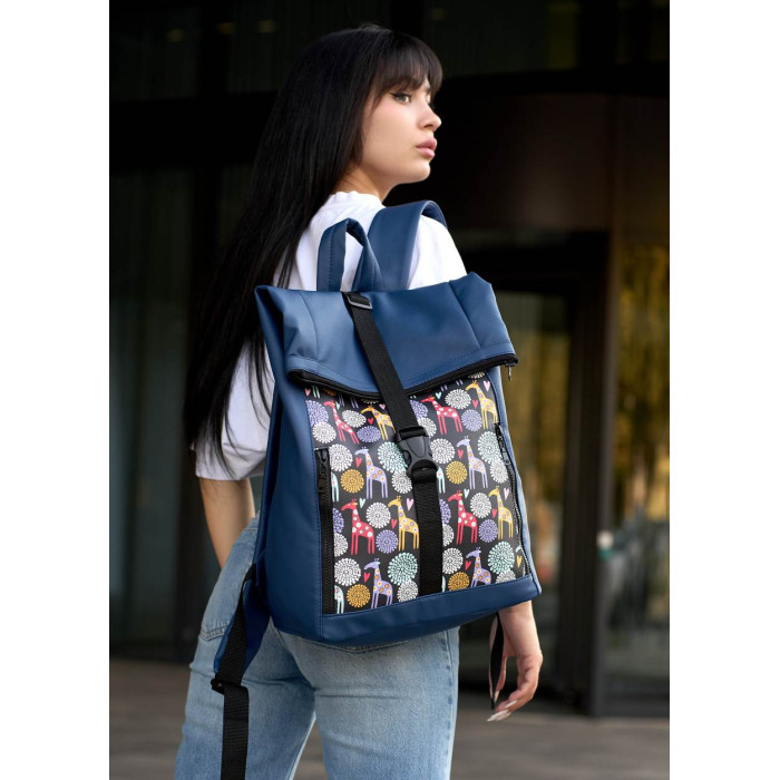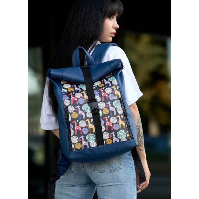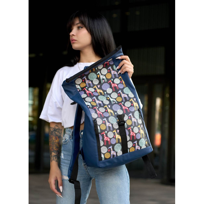 Женский рюкзак Sambag RollTop One синий с принтом "жираф"